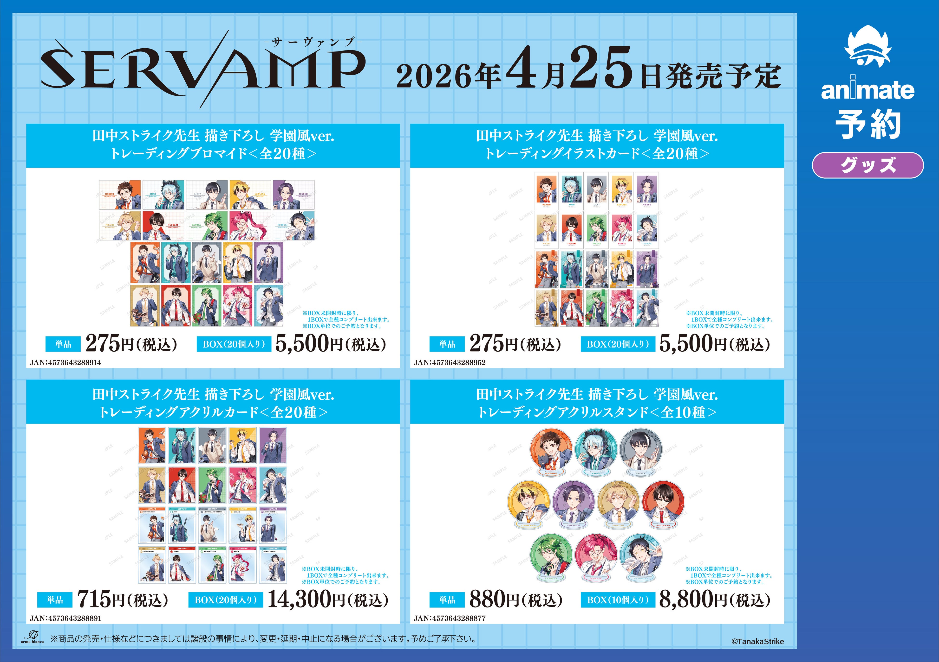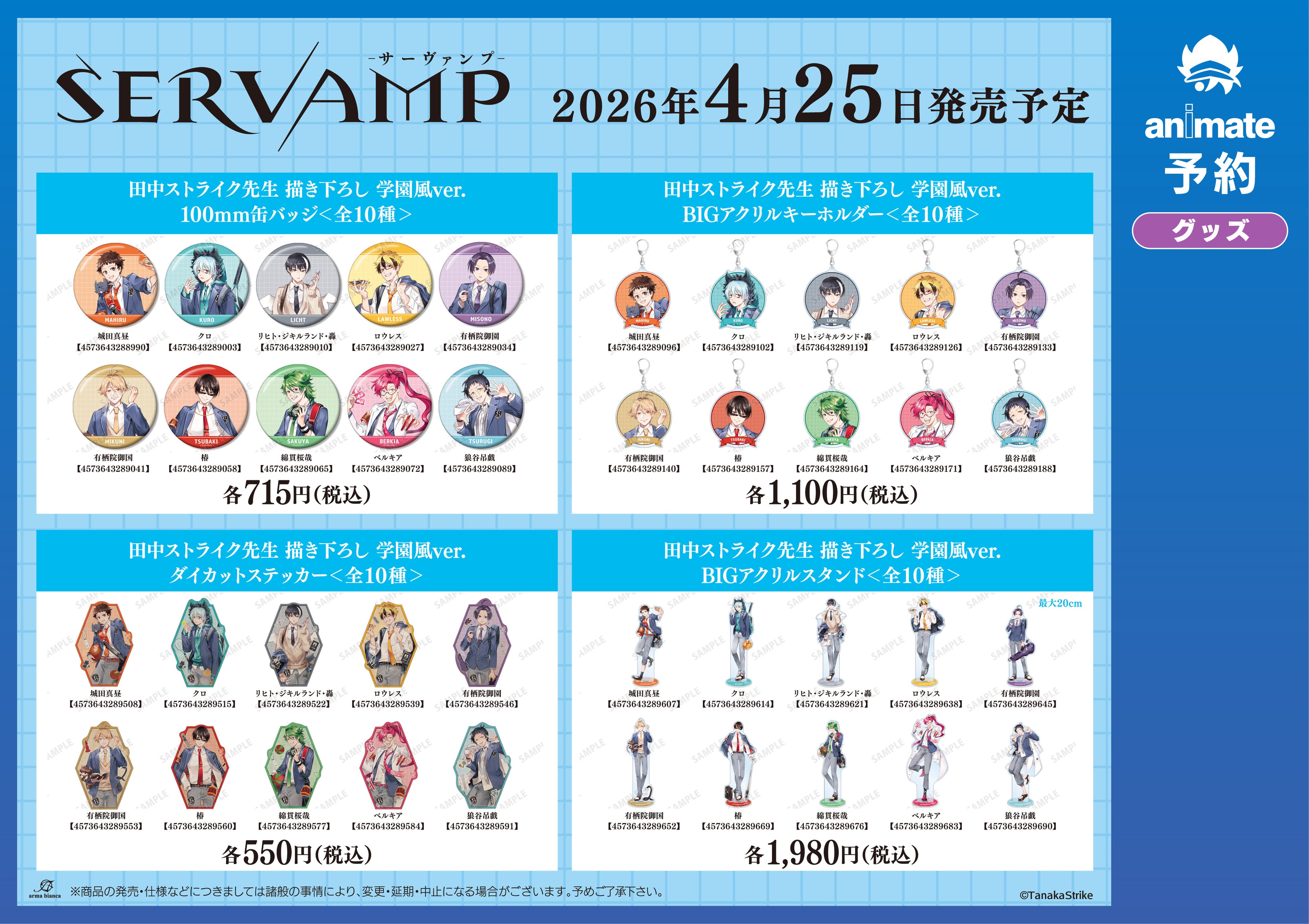 今回のフェアでは、田中ストライク先生による『SERVAMP-サーヴァンプ-』の「学園風」をコンセプトにした新規描き下ろしイラストを使用した新商品を多数先行販売する他、フェア特典を予定しております。