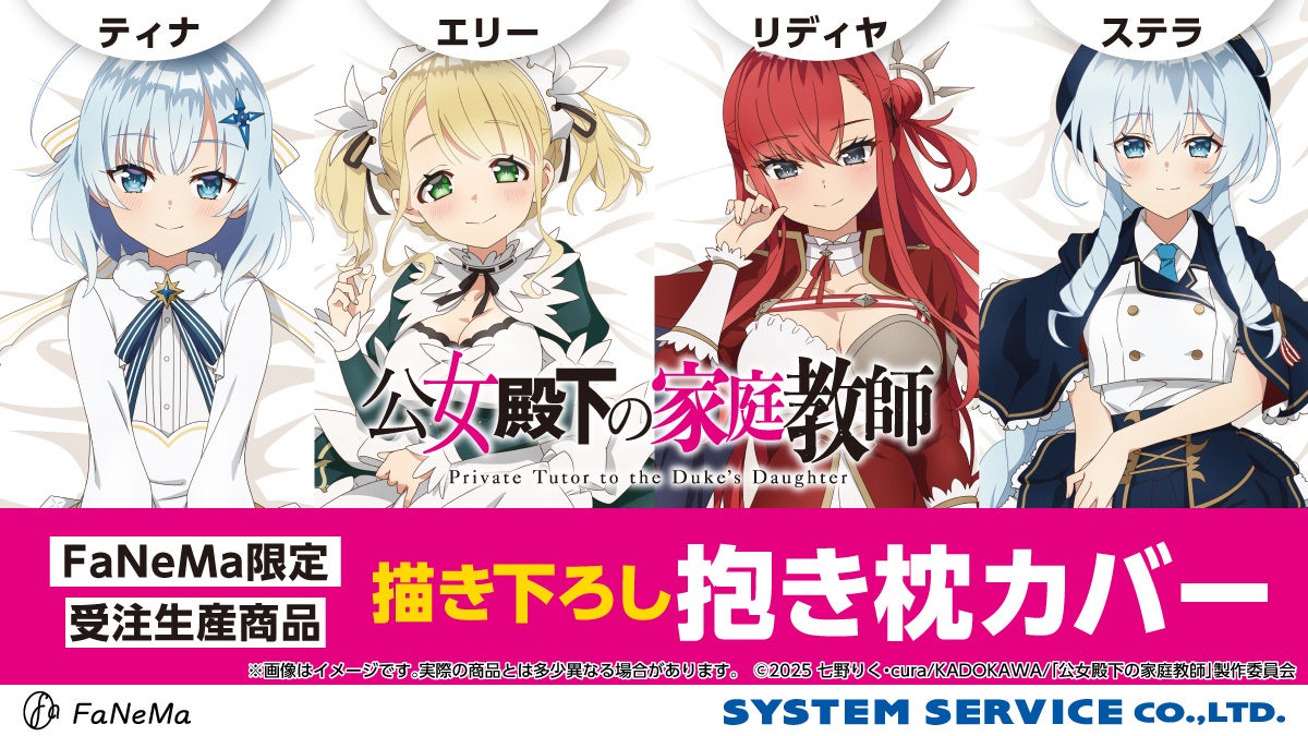 システムサービス株式会社(本社:東京都豊島区、代表取締役社長:田村宗弘)は、アニメ・マンガ・ゲーム作品等のキャラクター商品の企画・製作・販売をする自社ECサイト「FaNeMa」(URL:https://fanema.jp/)にて、『公女殿下の家庭教師』より、「抱き枕カバー」を再受注いたします。