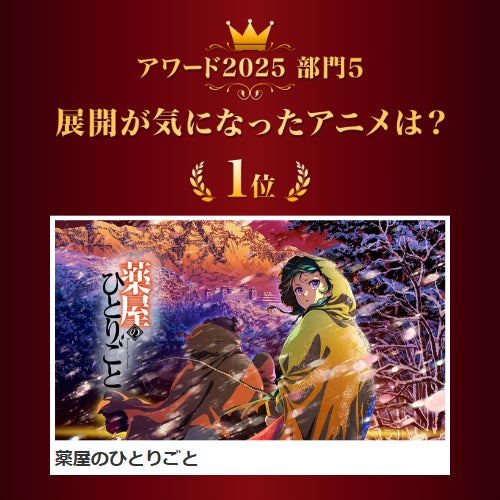 国内最大級(※1)の7,200作品以上のアニメが見放題(※2)の「dアニメストア」( https://animestore.docomo.ne.jp/ )では、昨年もたくさんの傑作アニメが配信されました。dアニメストアでは【2025年に1番○○だったアニメ】を決めるアンケートを2025年12月13日~2026年1月10日に実施。ユーザー3,700人以上の方にご回答いただき、8部門の受賞作品が決定いたしました!!