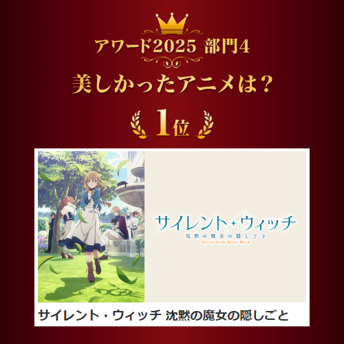 “オススメしたいアニメ部門”に続いて“美しかったアニメ部門”の第1位は『サイレント・ウィッチ 沈黙の魔女の隠しごと』!!