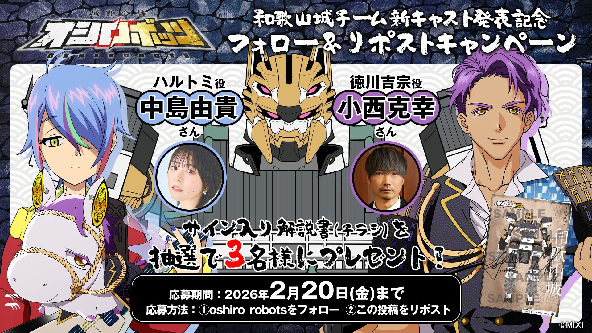 株式会社MIXI(東京都渋谷区、代表取締役社長 上級執行役員 CEO:木村 弘毅)は、MIXI_ANIMEオリジナルコンテンツ『城郭合体オシロボッツ』において、オシロボット和歌山城パイロット「ハルトミ」役を中島由貴さん、シロダマ(武将)「徳川吉宗」役を小西克幸さんが担当することをお知らせします。このキャスト発表を記念して、サイン入り解説書(チラシ)が抽選で当たるキャンペーンも実施します。今後も各オシロボットのパイロットおよびシロダマ(武将)のキャラクターボイス(CV)を順次追加していく予定です。