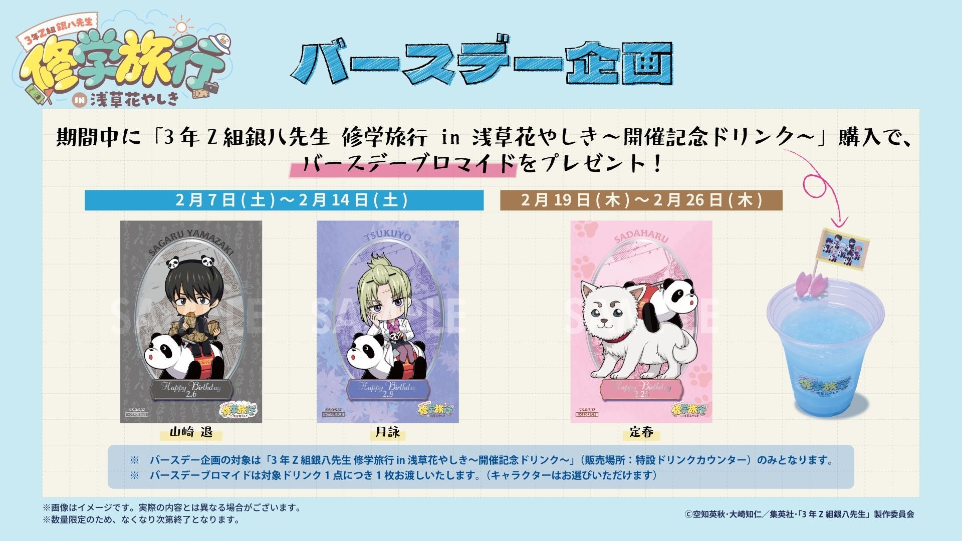 上記期間中に「3年Z組銀八先生 修学旅行 in 浅草花やしき~開催記念ドリンク~」をご購入いただくと「バースデーブロマイド」を1枚プレゼント ※数量限定