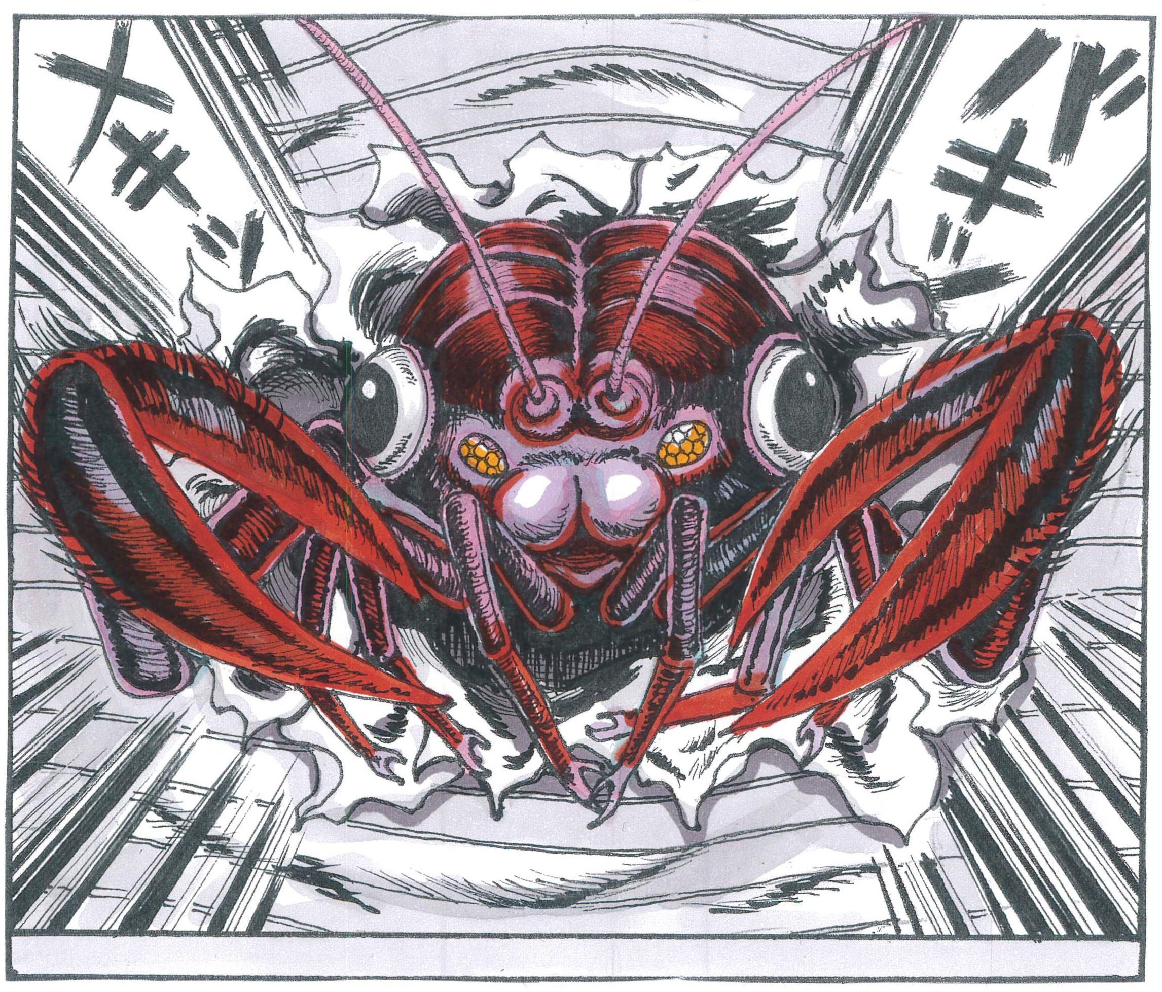 恐ろしすぎるフォルムの怪虫と翔ちゃんの表情が、グランジ感溢れるダメージ仕様のプリントでハードコアに描かれる絶望的な1枚。