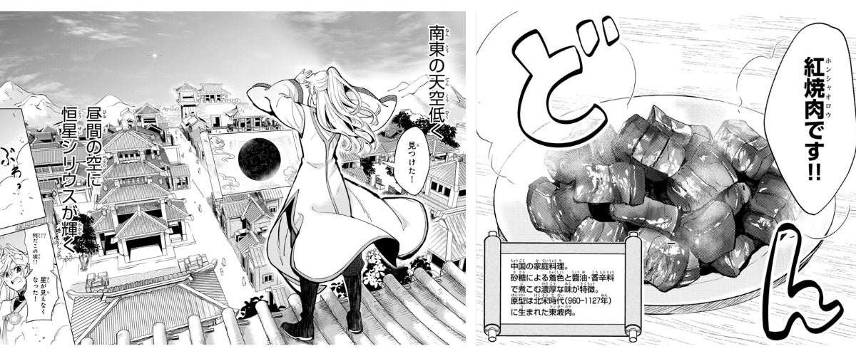 また、本作のもう一つの魅力は、現代人の趙辰が1300年前の唐に転生することで始まる「グルメ漫画」であるということ! 1話では、豚を食べる文化のない当時の唐に「紅焼肉」(角煮のような豚の煮物)を持ち込み波乱を起こしますが、豚を美味しく食べるための「現代知識」は日常的に豚肉を食べる私たちでも知らない方も多い情報で、牛・豚・羊など「肉食」の歴史も垣間見えます。