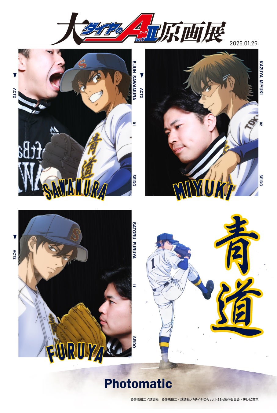 『ダイヤのA』シリーズのメインキャラクターである沢村栄純、御幸一也、降谷暁と一緒に写真に収まることができる「ツーショット風」のデザイン。松本晴投手・谷川原選手にはそれぞれ思い思いのポーズで撮影していただきました!コラボフレームは4月18日(土)まで販売中。ぜひ思い出の1枚をお持ち帰りください!