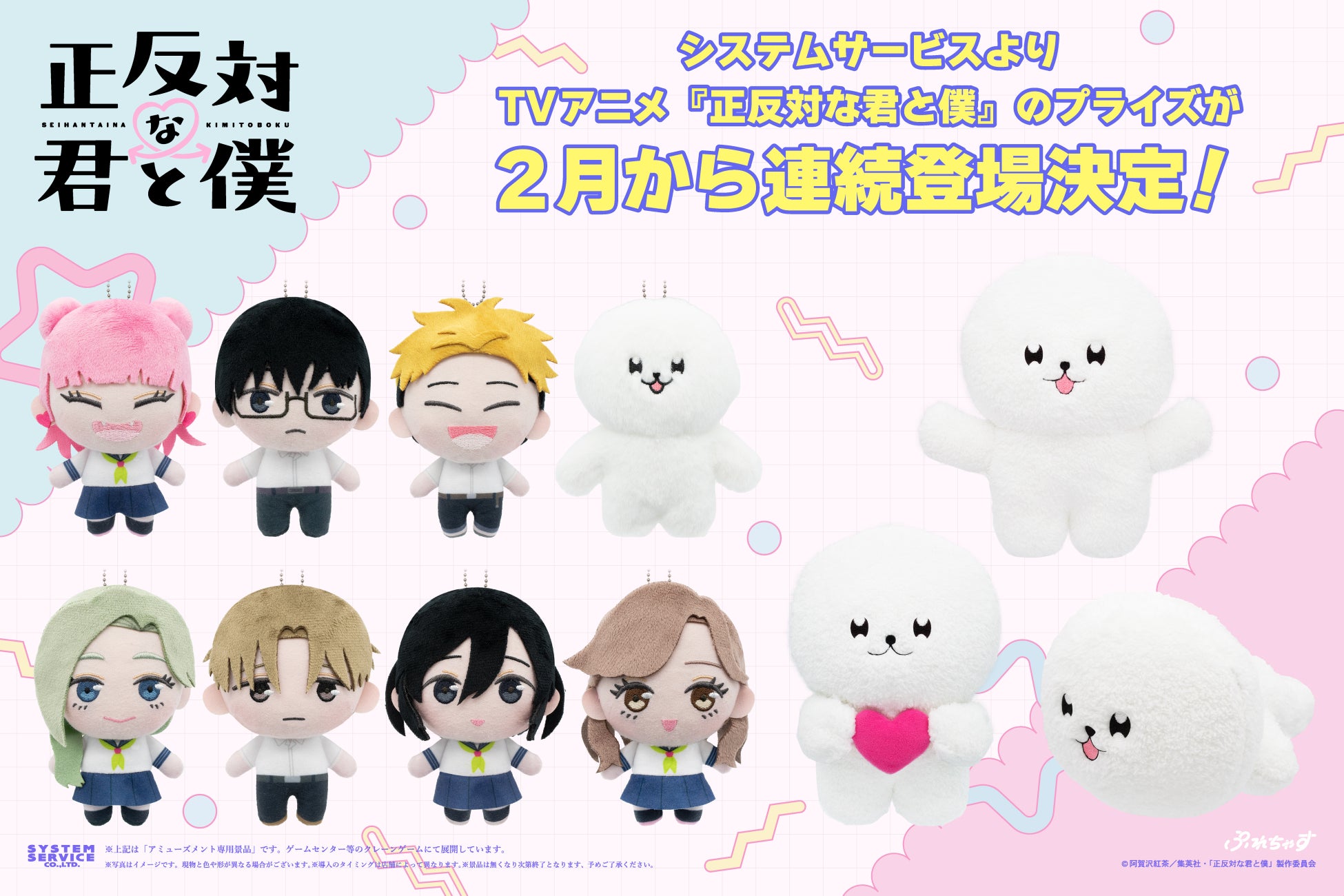 システムサービス株式会社(本社:東京都豊島区、代表取締役社長:田村宗弘)は、TVアニメ 『正反対な君と僕』のプライズ商品を2026年2月より順次アミューズメント施設にて展開いたします。