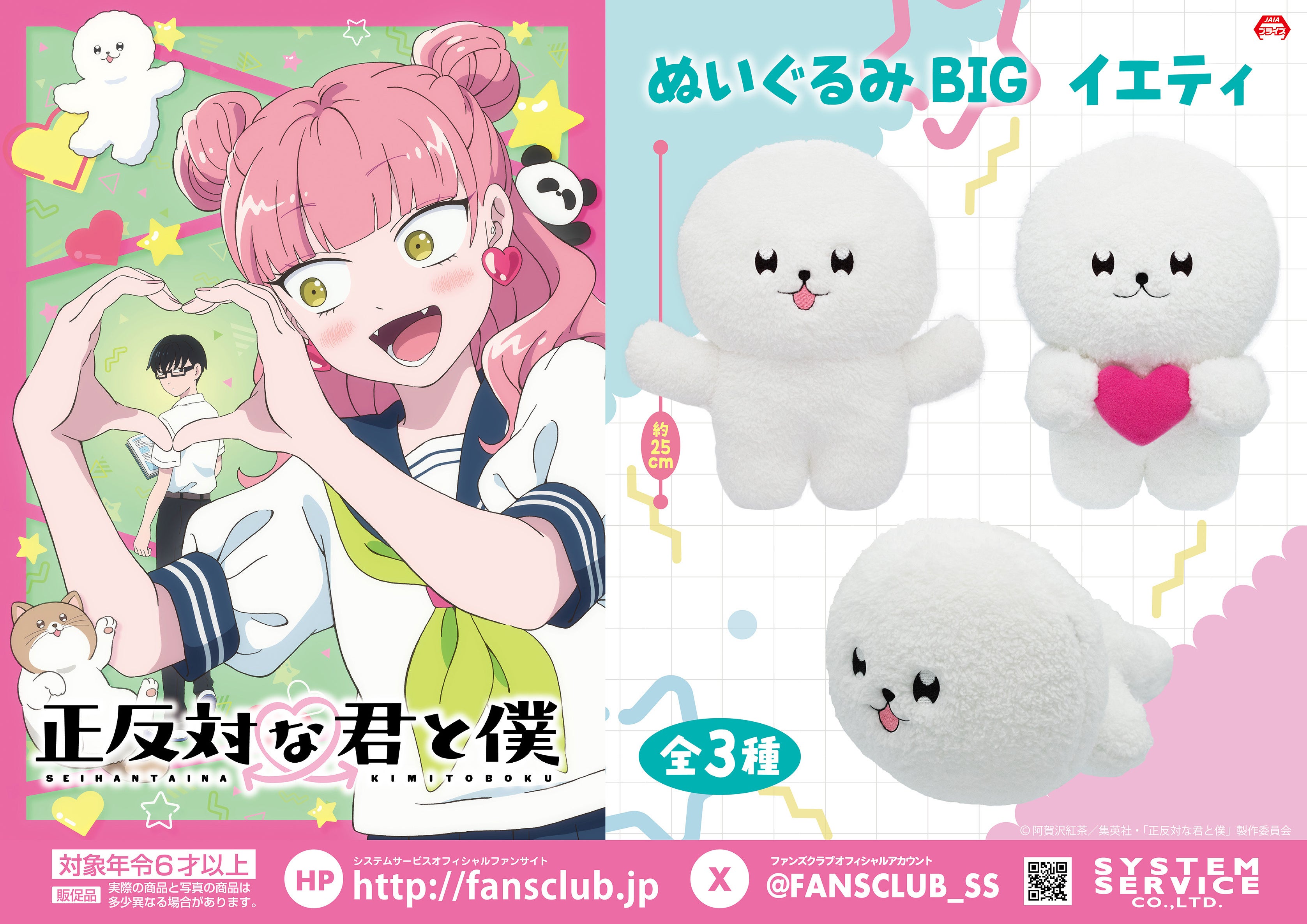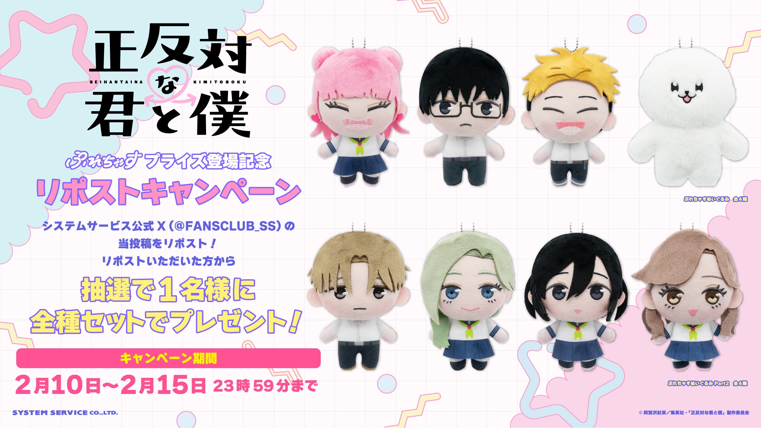 システムサービス株式会社(本社:東京都豊島区、代表取締役社長:田村宗弘)は、TVアニメ 『正反対な君と僕』のプライズ商品を2026年2月より順次アミューズメント施設にて展開いたします。