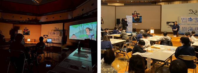 また翌7日(土)には、夕鶴の里資料館にて同作品の上映会を開催しました。このイベントは、次世代へ豊かで美しい海を引き継ぐために、海を介して人と人とがつながる“日本財団「海と日本プロジェクト」”の一環で実施しています。