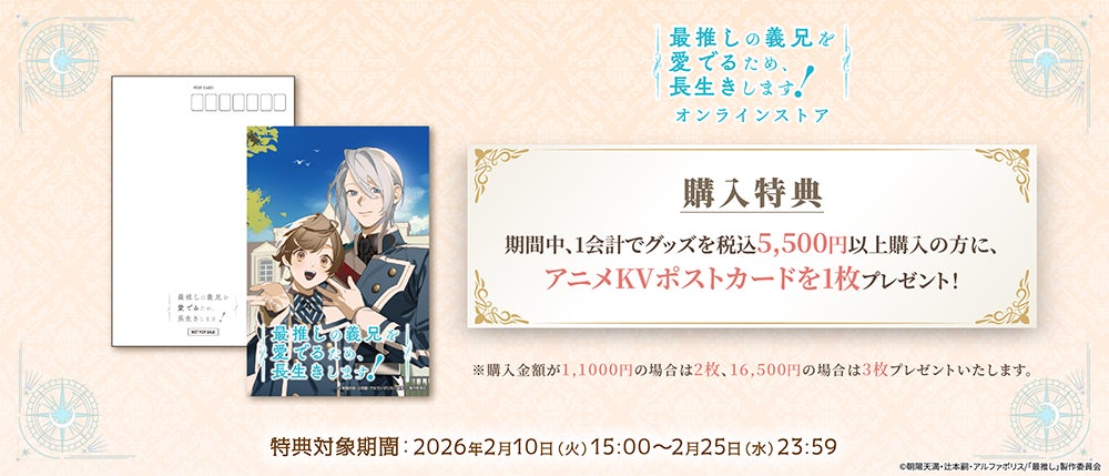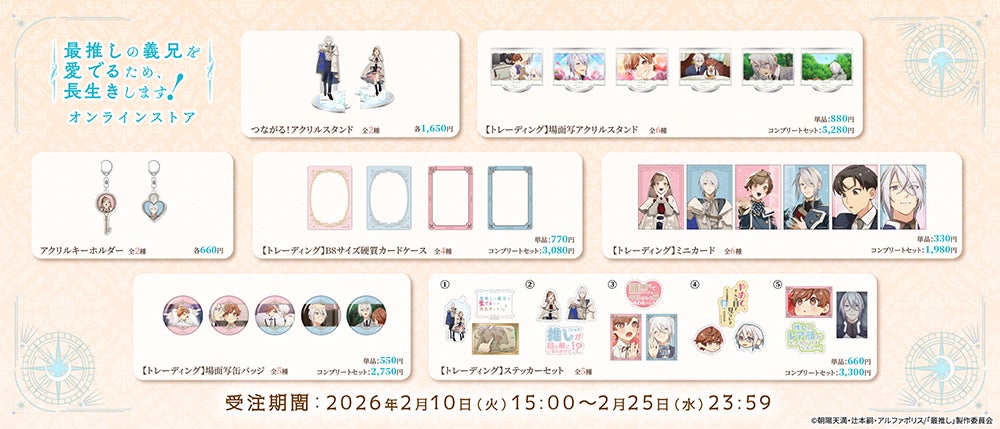 株式会社サイバード(本社:東京都品川区、代表取締役社長 兼 CEO 長嶋 貴之、以下「サイバード」)が運営するECショップ「オシモール」にて、tvk(テレビ神奈川)にて放送中のTVアニメ『最推しの義兄を愛でるため、長生きします!』の第1弾オリジナルグッズの受注販売を、2026年2月10日(火)~2月25日(水)までの期間限定で開催します。