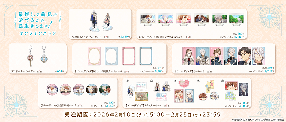 株式会社サイバード(本社:東京都品川区、代表取締役社長 兼 CEO 長嶋 貴之、以下「サイバード」)が運営するECショップ「オシモール」にて、tvk(テレビ神奈川)にて放送中のTVアニメ『最推しの義兄を愛でるため、長生きします!』の第1弾オリジナルグッズの受注販売を、2026年2月10日(火)~2月25日(水)までの期間限定で開催します。