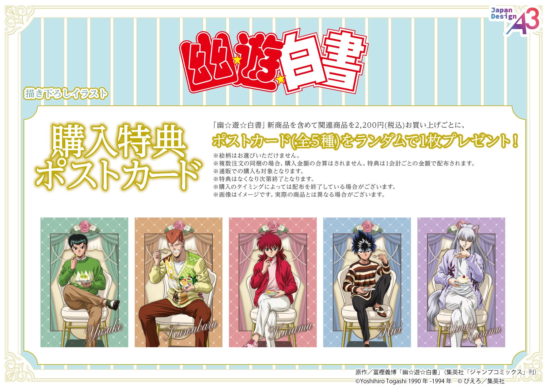 TVアニメ『幽☆遊☆白書』の新商品を含む関連商品を1会計2,200円(税込)お買い上げごとに、購入特典としてポストカード(全5種)をランダムで1枚プレゼント!