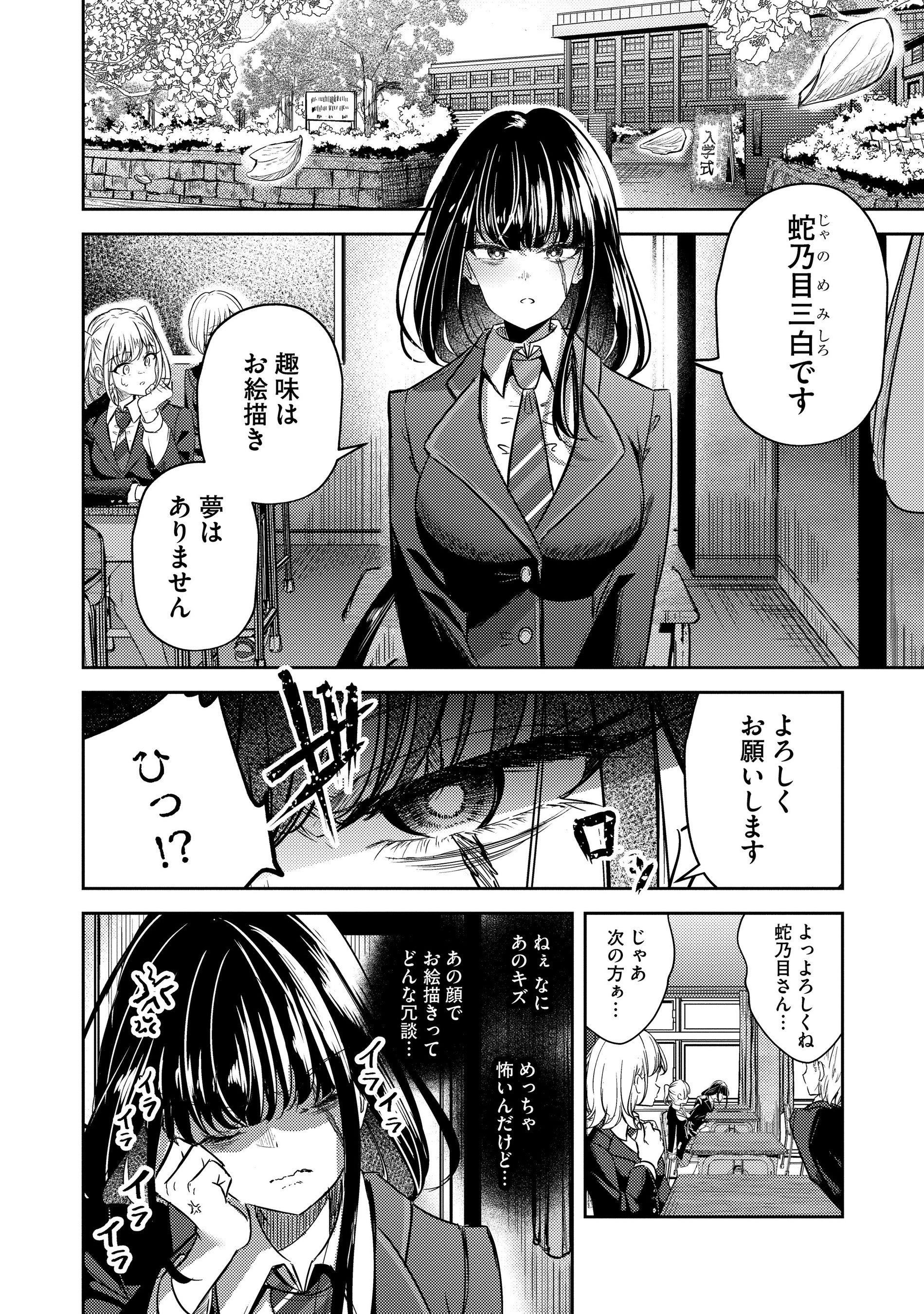 顔に傷を負ったことが原因で周りから敬遠され心を閉ざしてしまった高校1年生の蛇乃目三白。唯一の心の支えは絵を描くことだけだったが、高校に入学すると先輩・猫宮黒絵と運命的な出逢いを果たす。