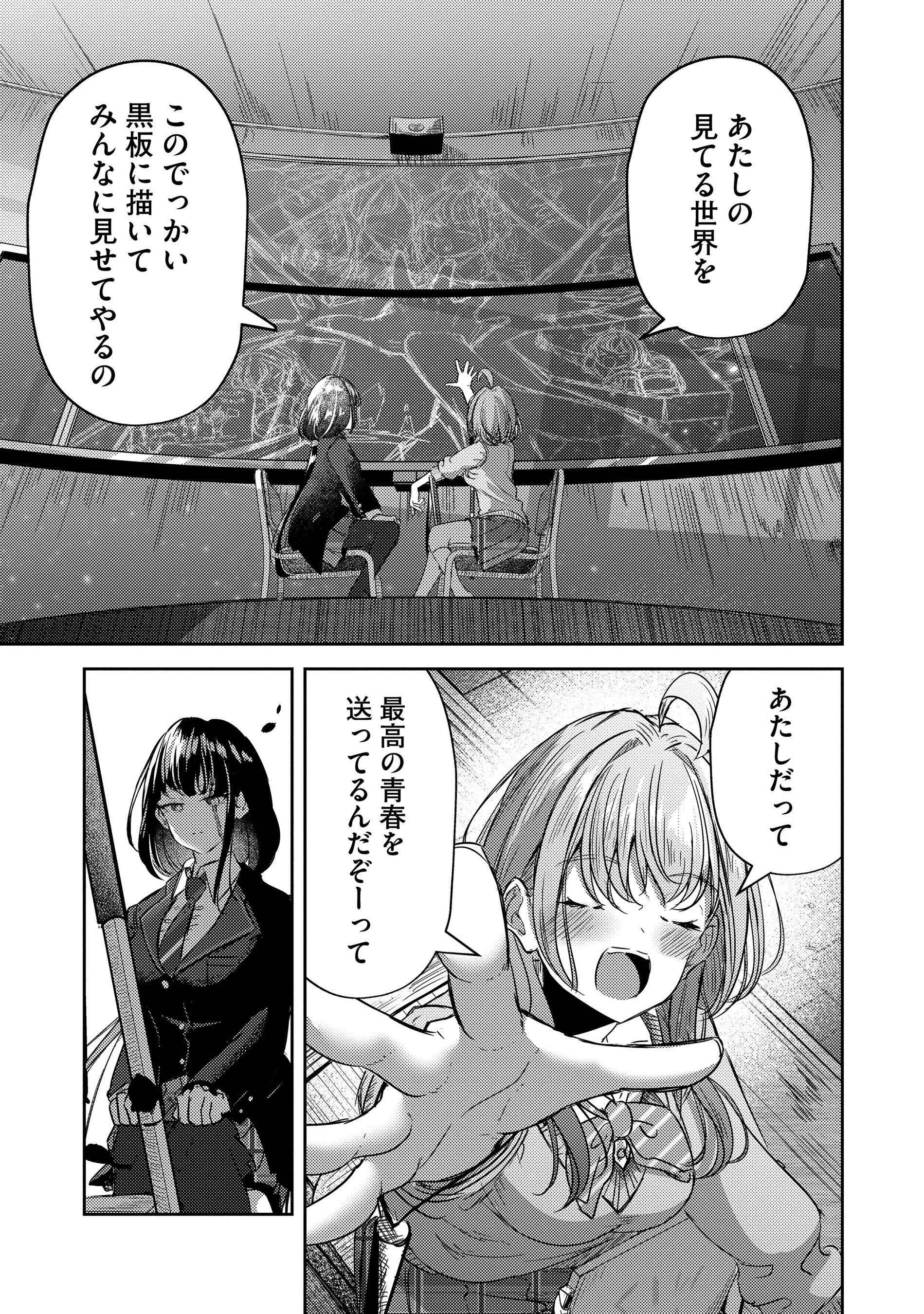 黒絵との出逢ったことで三白の日常は少しずつ変わり始め、やがて黒板アートを通してふたりの間にはかけがえのない友情と絆が芽生え…。運命の出逢い。重なる想い。キャンバスに刻む青春群像劇、開幕です。