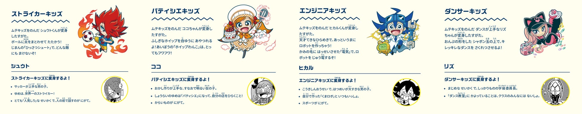 ストライカーキッズ(シュウト) パティシエキッズ(ココ) エンジニアキッズ(ヒカル) ダンサーキッズ(リズ)
