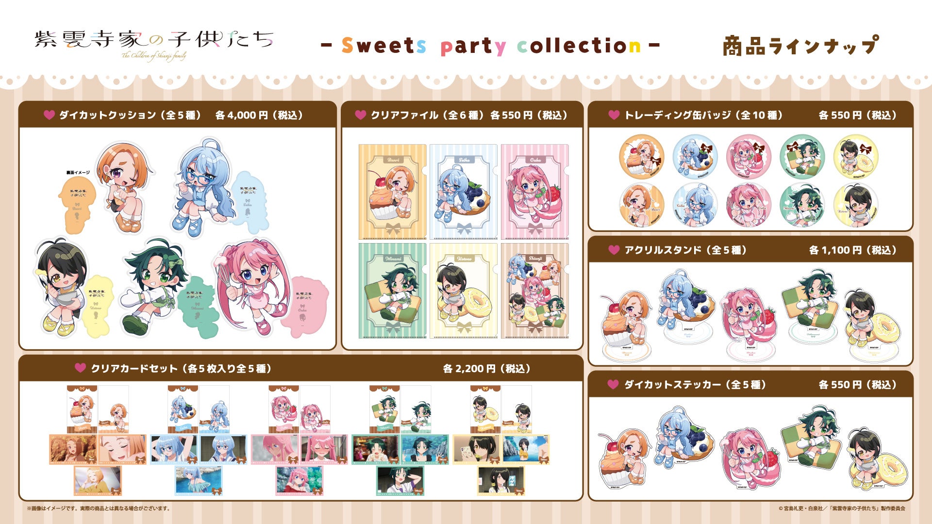 販売に先立ち、『QINOCOPストア』にて先行予約を開始。TVアニメ「紫雲寺家の子供たち」スイーツに囲まれたキャラクターたちの商品が登場