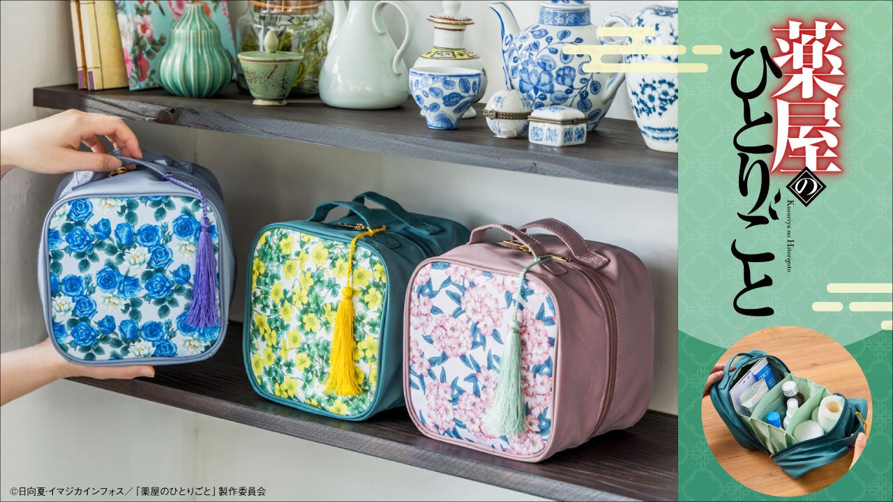ガバッと開くと、収納スペースがせり上がる仕様が大好評のお薬箱ポーチに、TVアニメ『薬屋のひとりごと』の世界観を彩る花々のデザインが登場です。すっきり整頓できる3層構造やメッシュポケットで中身が見やすく、サイズや形状がさまざまなお薬はもちろん、処方箋袋も丸ごと収納できる、まさに作品コラボにぴったりなポーチは、物語にも登場する〈青い薔薇〉〈カタバミ〉〈シャクナゲ〉の3種類。家族ごとに使い分けたりするほか、お薬以外の手芸道具やコスメ類などの収納にも便利に使えます。