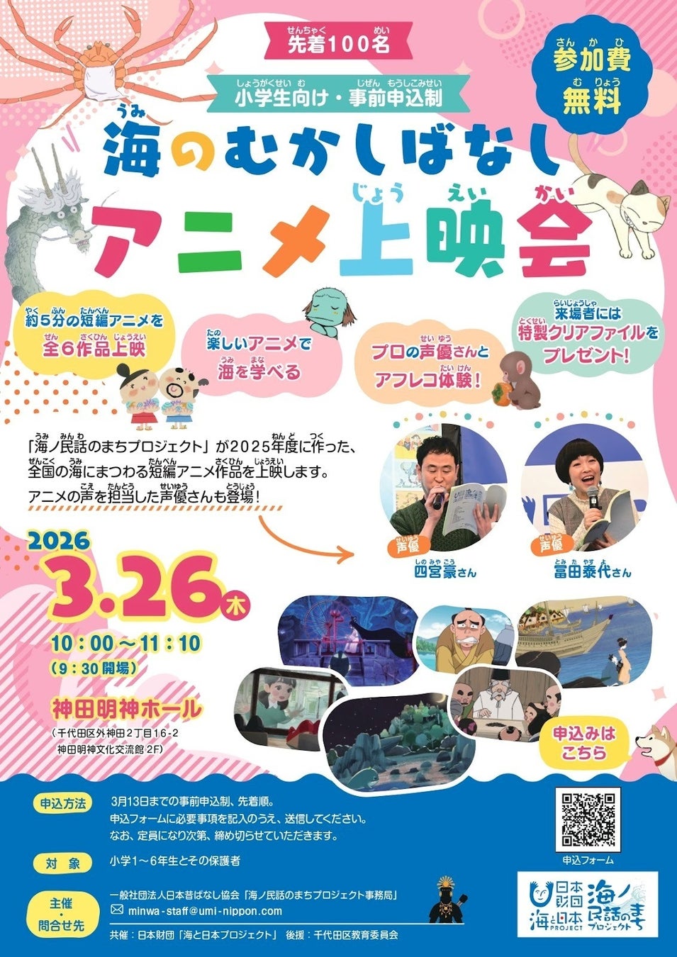 2026年3月26日(木) 【第1部】海のむかしばなしアニメ上映会 10:00~11:10 【第2部】スペシャルセッション~民話から創造する新たな世界~ 14:30〜17:00 |