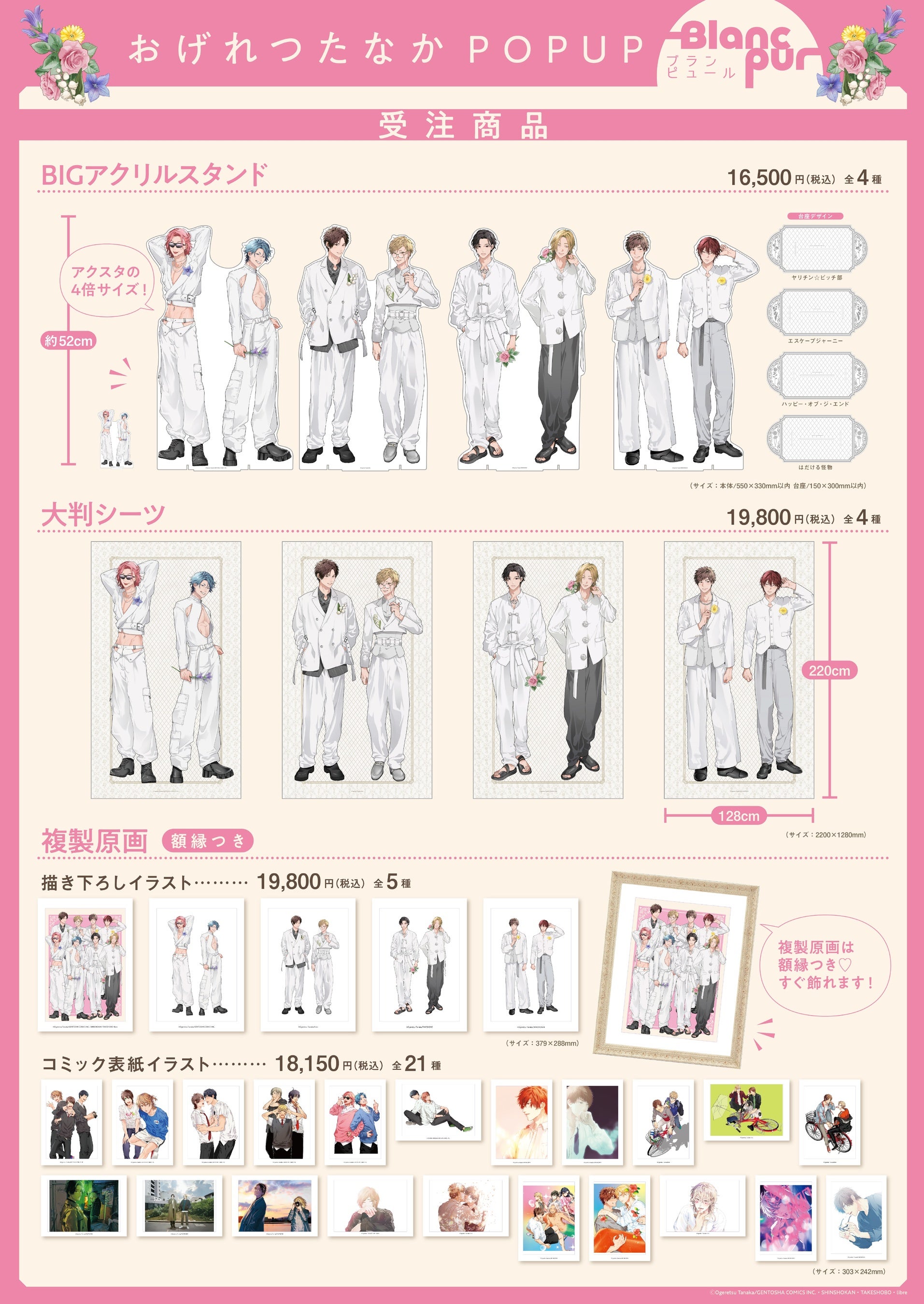 おげれつたなか氏が描く“濃密な「白」の世界”をテーマに、代表作品『ヤリチン☆ビッチ部』(幻冬舎コミックス)、『はだける怪物』(新書館)、『ハッピー・オブ・ジ・エンド』(竹書房)、『エスケープジャーニー』(リブレ)から8人のキャラクターのオリジナル描き下ろしイラスト等を使用したオリジナルグッズやアート商品を販売します。