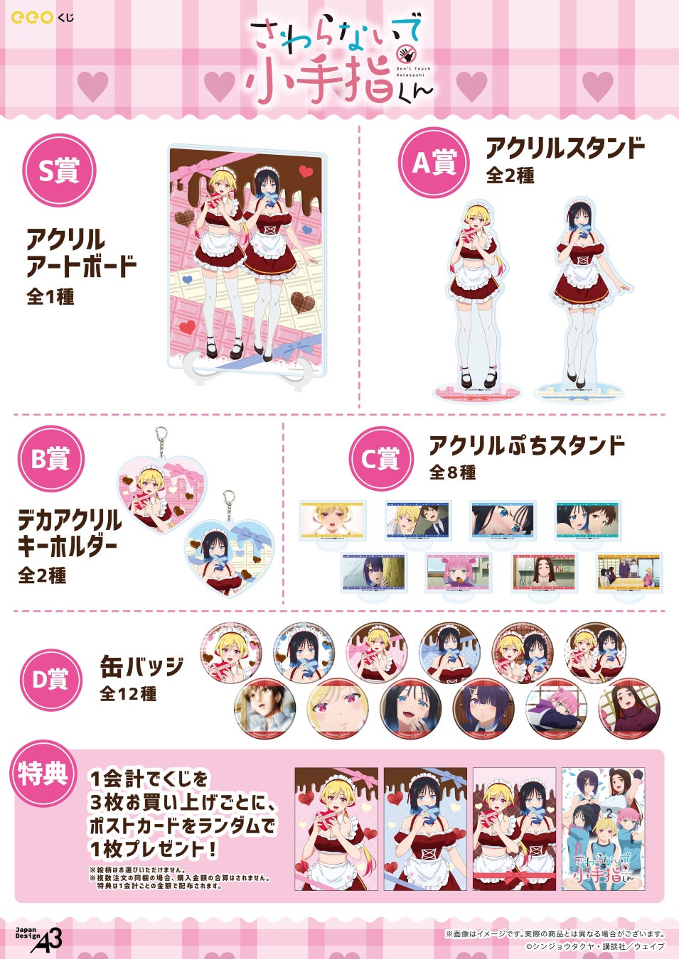 『さわらないで小手指くん』の「eeoくじ」を1会計3枚お買い上げごとに、購入特典としてポストカード(全4種)をランダムで1枚プレゼント。ここでしか手に入らない限定品ですので、ぜひコンプリートを目指して集めてみてください!