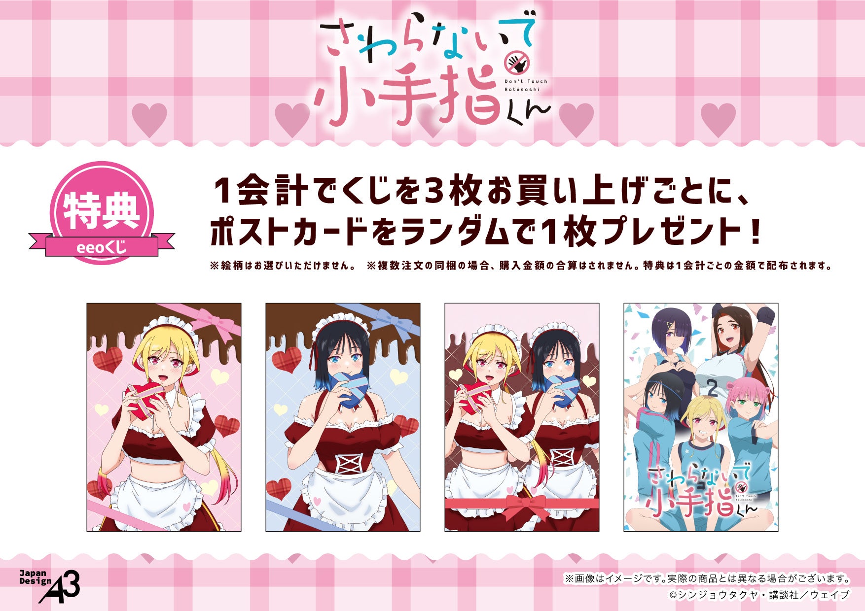 『さわらないで小手指くん』の「eeoくじ」を1会計3枚お買い上げごとに、購入特典としてポストカード(全4種)をランダムで1枚プレゼント。ここでしか手に入らない限定品ですので、ぜひコンプリートを目指して集めてみてください!