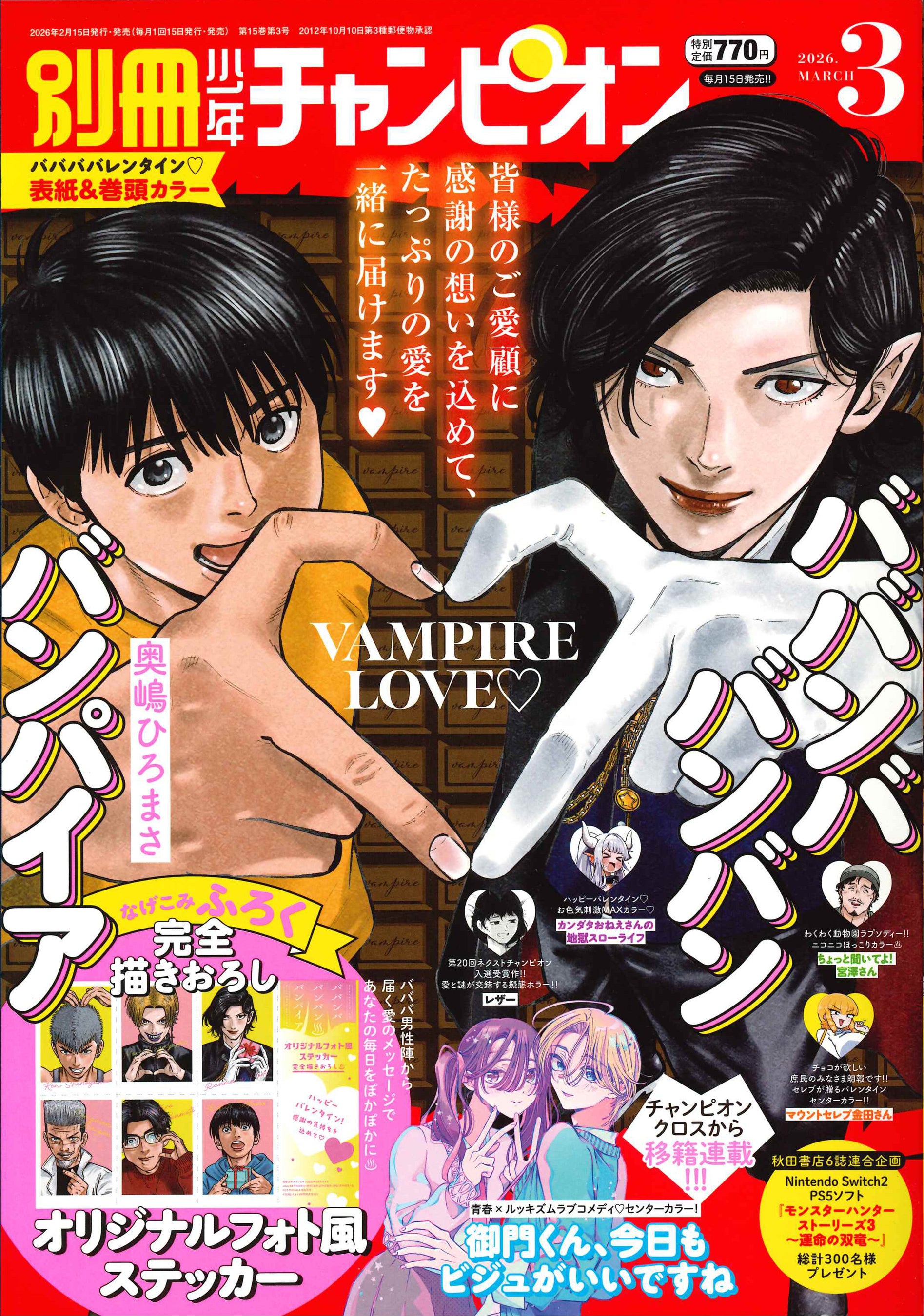 株式会社秋田書店(所在地:東京都文京区、代表取締役社長:山口徳二)は、発行している漫画誌『別冊少年チャンピオン』(編集長:小口太郎)2月14日(土)発売の3月号にて、表紙&巻頭カラーに『ババンババンバンバンパイア』(著:奥嶋ひろまさ)を掲載。付録では、完全描き下ろし『ババンババンバンバンパイア』オリジナルフォト風ステッカーが登場することをお知らせいたします。