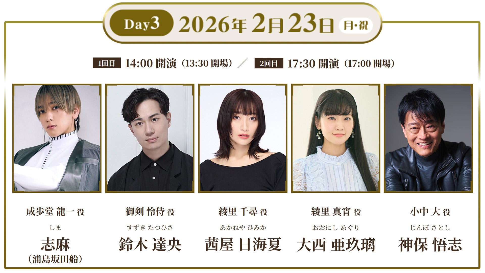 メインキャスト: 茜屋日海夏 / 大西亜玖璃 / 志麻 / 神保悟志 / 鈴木達央