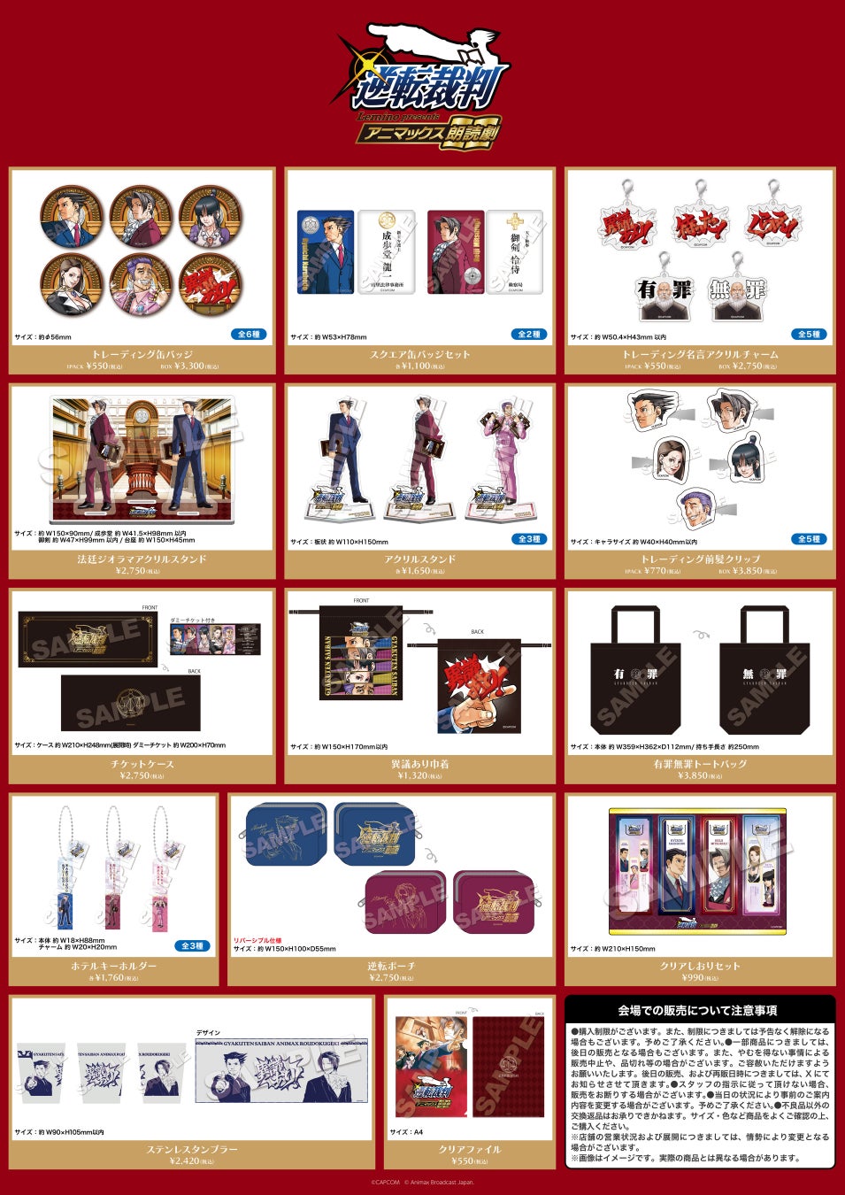 “キャストとお揃いの台本”を持ったキャラクターの「アクリルスタンド」をはじめ、成歩堂龍一と御剣怜侍がリバーシブルになる「逆転ポーチ」や綾里姉妹の「前髪クリップ」、小中大の「ホテルキーホルダー」、「有罪無罪トートバッグ」など、今までにないオリジナルグッズを手に取って、本番当日の法廷バトルを最大級にお楽しみください。