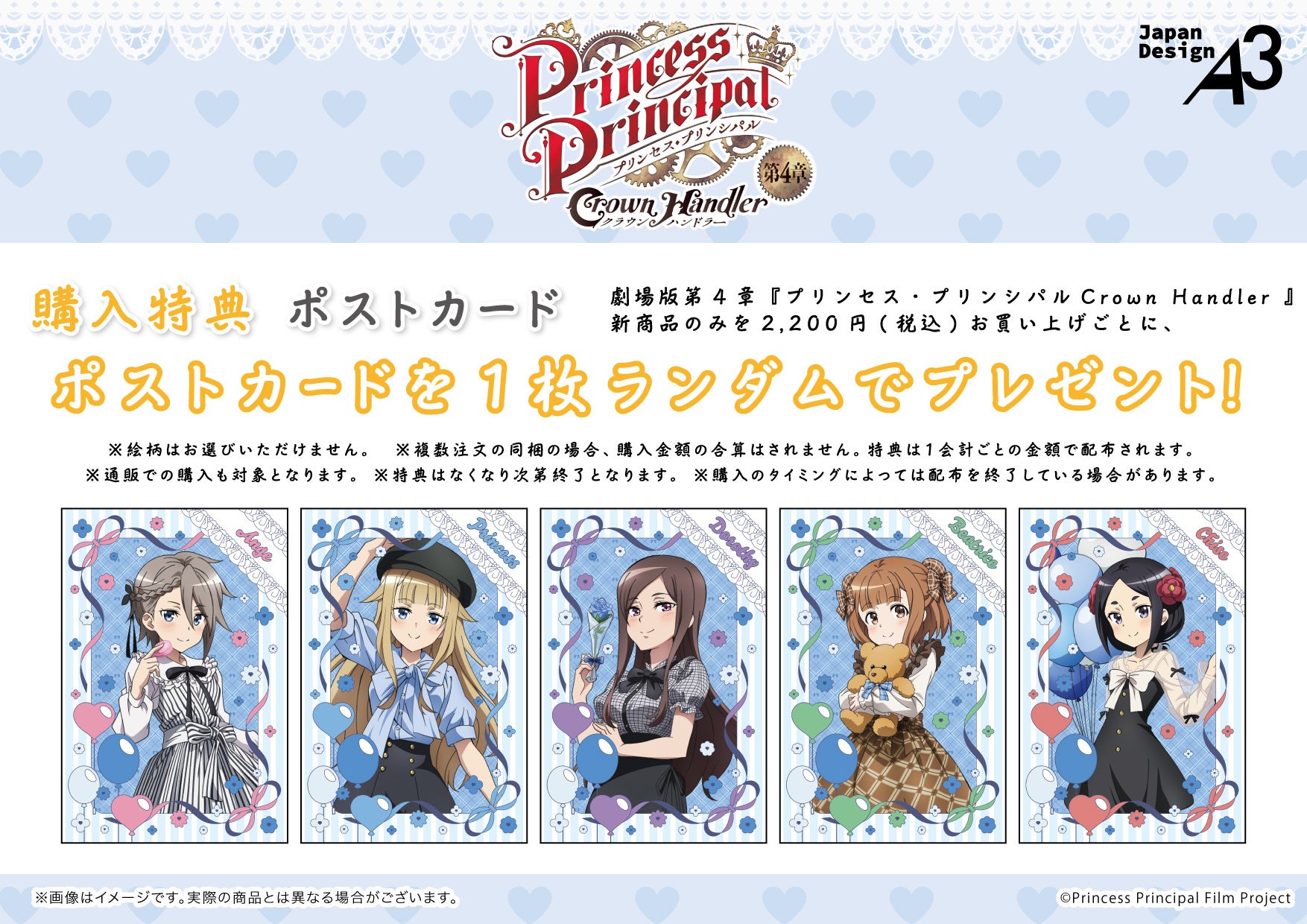 『プリンセス・プリンシパル Crown Handler』第4章の新商品のみを1会計2,200円(税込)お買い上げごとに、購入特典としてポストカード(全5種)をランダムで1枚プレゼント!