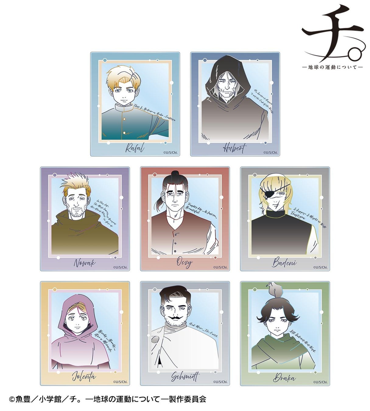 ラファウ、フベルト、ノヴァク、オクジー、バデーニ、ヨレンタ、シュミット、ドゥラカのイラストを文字と混ぜ合わせ、新たに描き起こし、アクリルカードに仕上げました。