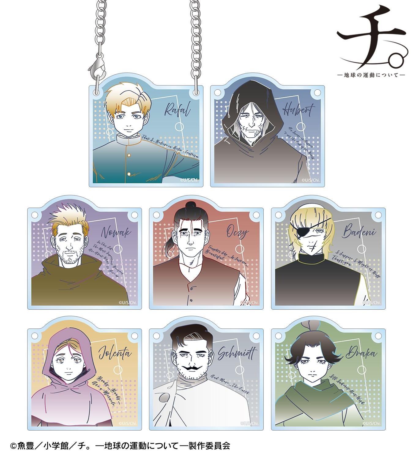 ラファウ、フベルト、ノヴァク、オクジー、バデーニ、ヨレンタ、シュミット、ドゥラカのイラストを文字と混ぜ合わせ、新たに描き起こし、暗所で発光する蓄光のアクリルにデザインしてアクリルキーホルダーに仕上げました。