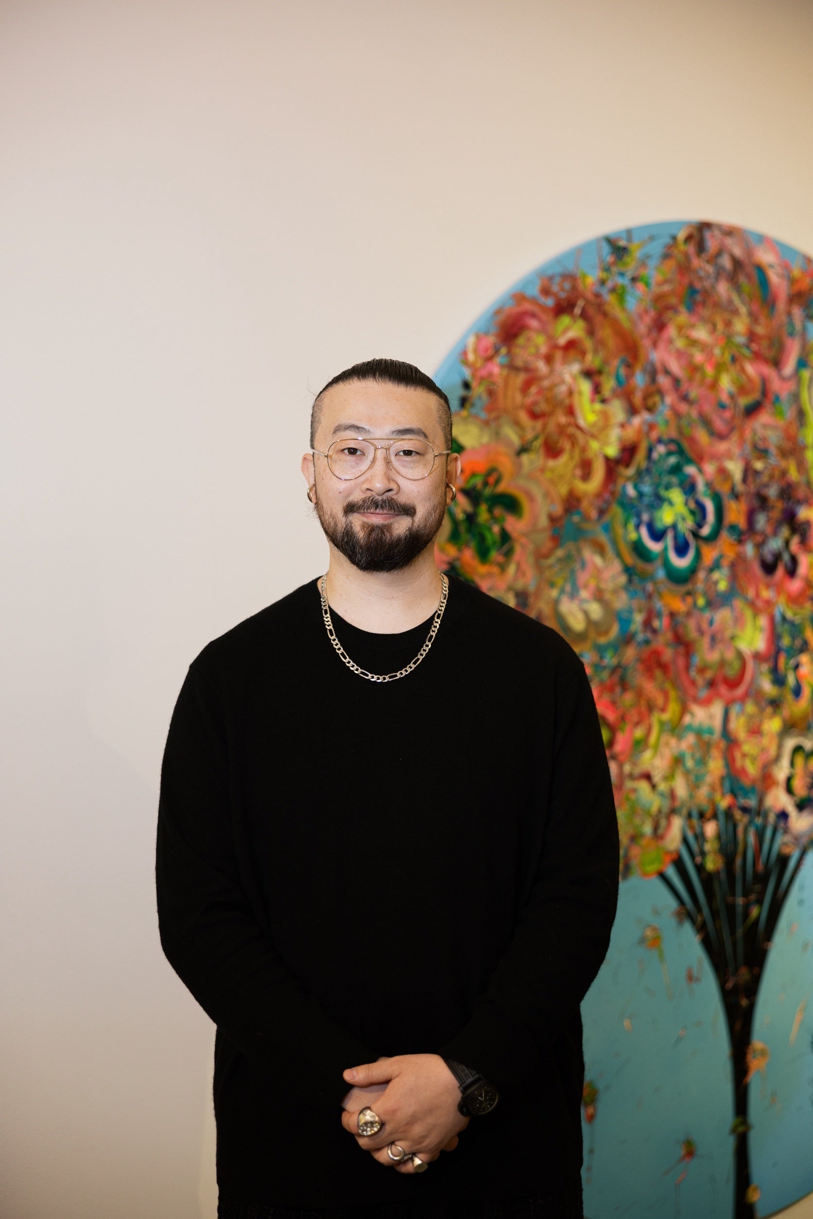 計算した線のみで構成された細密画で表現していたが、ここ数年「偶然性」に重きを置いた”花”の作品を中心に発表を続けている。さまざまな色味で表現される花はポップなイメージが強いが、花びら一つ一つに緻密な線描が施されている。彼自身、花に見えなくてもいいと語るそれは確かに具象としての花ではない。作家が「自己をサルベージ(救出・救助)する」なかでたどり着いた、幼少期の記憶がもととなっていると語る。コロナ禍をきっかけに、当たり前と感じていたことが実は特別な出来事だったと気づき、「感謝を作品にしたい」という思いから「with gratitude」をテーマに作品を製作している。