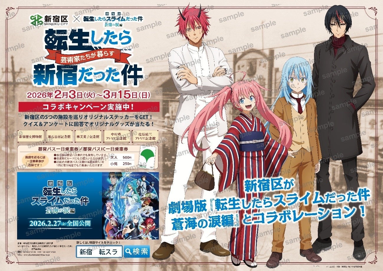 大人気アニメ作品 劇場版 「転生したらスライムだった件 蒼海の涙編」と新宿区がタイアップし、区立博物館・記念館5館(新宿歴史博物館・林芙美子記念館・佐伯祐三アトリエ記念館・中村彝アトリエ記念館・漱石山房記念館)のキャンペーンイベント「転生したら芸術家たちが暮らす新宿だった件」を3月15日(日)まで開催中です。