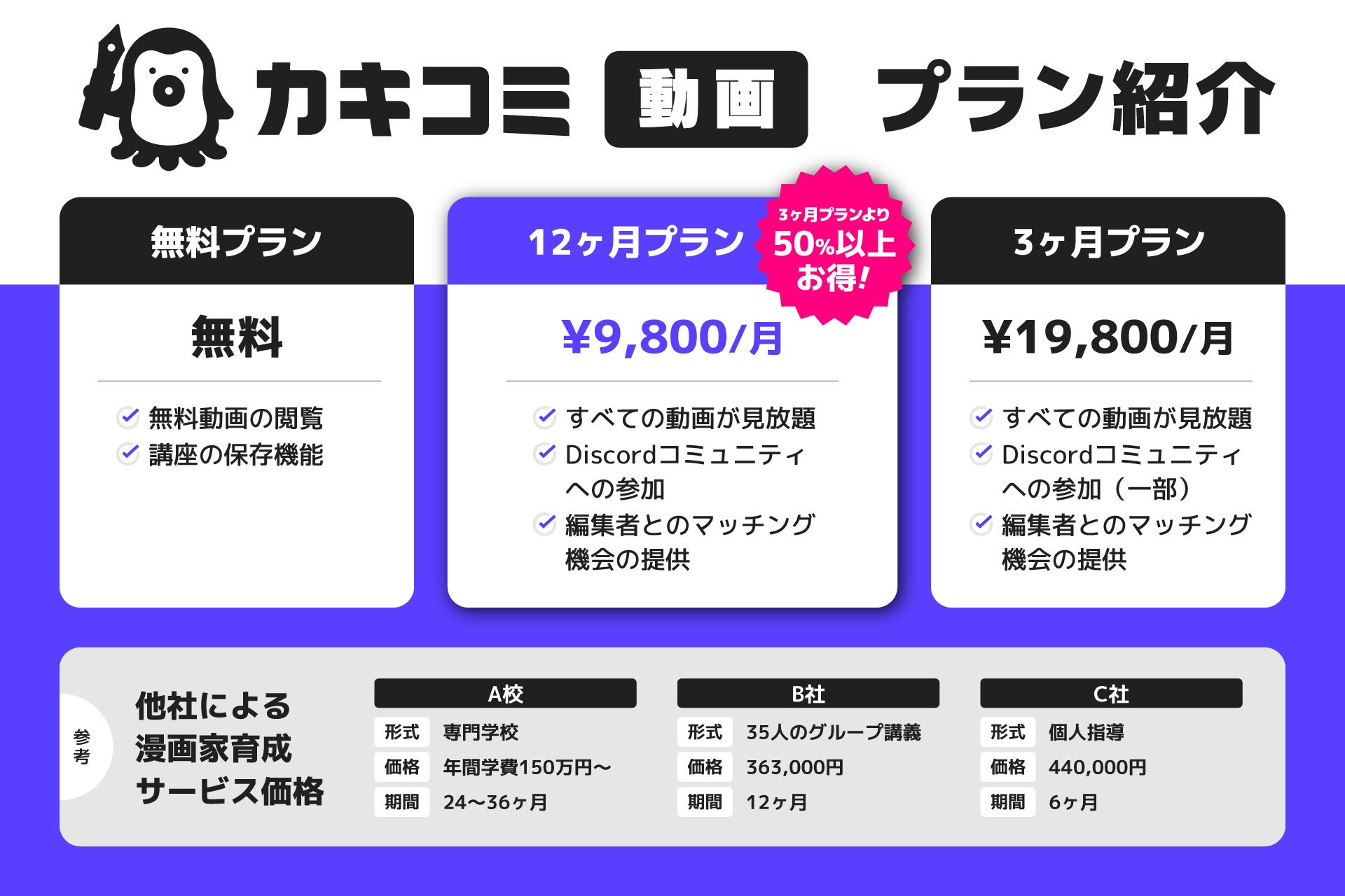 『カキコミ』では、皆様の挑戦を「点」で終わらせず、確かな「線」の成長にするため、仕事やマッチングに直結する機能を12ヶ月プランに集約いたしました。
