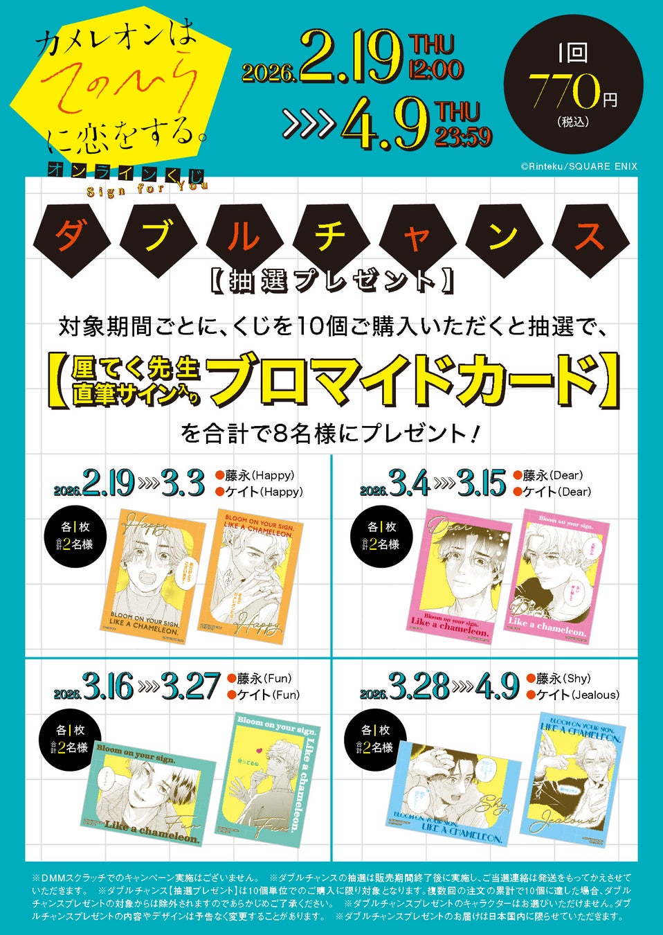本日2026年2月19日正午より、スクウェア・エニックス e-STORE、DMMスクラッチにて『カメレオンはてのひらに恋をする。』(厘てく先生)のオンラインくじの予約受付が開始いたしました。