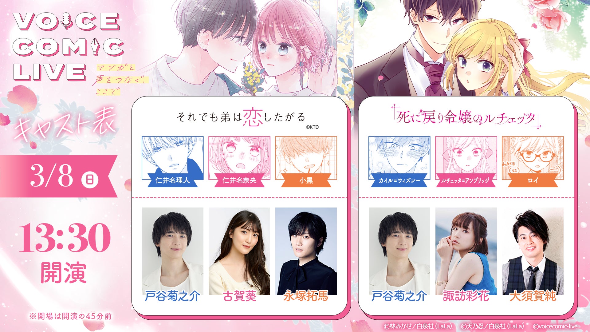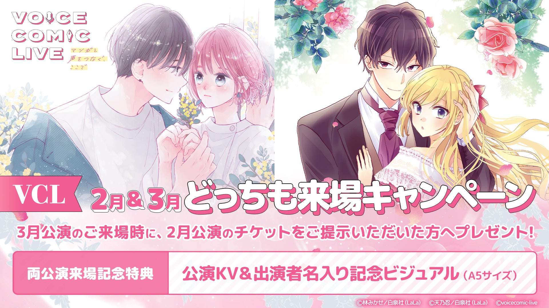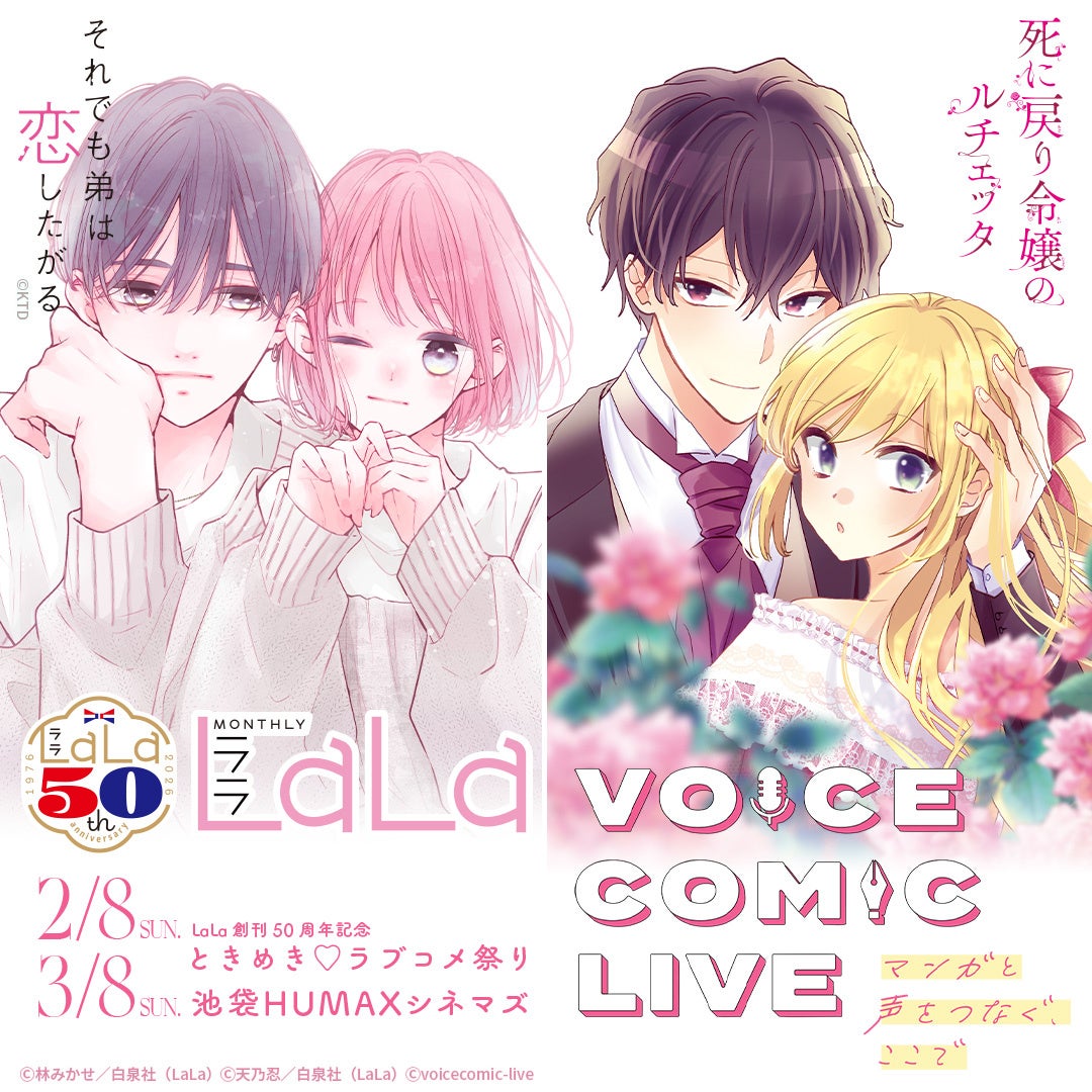 株式会社ヒューマックスエンタテインメント(東京都新宿区、代表取締役社長:秋元巳智雄)が、池袋HUMAXシネマズにて開催する『ボイスコミックライブ』の2026年2月8日(日)の出演者が決定しました。本公演は白泉社のLaLa50周年記念公演として「ときめき♡ラブコメ祭り」と題して開催します。『ボイスコミックライブ』は、スクリーンに映るマンガのキャラクターに、声優がライブで声を吹き込むステージイベントです。生の演技だからこそ味わえる緊張感と臨場感が、観客の皆様を物語の世界へエスコートいたします。