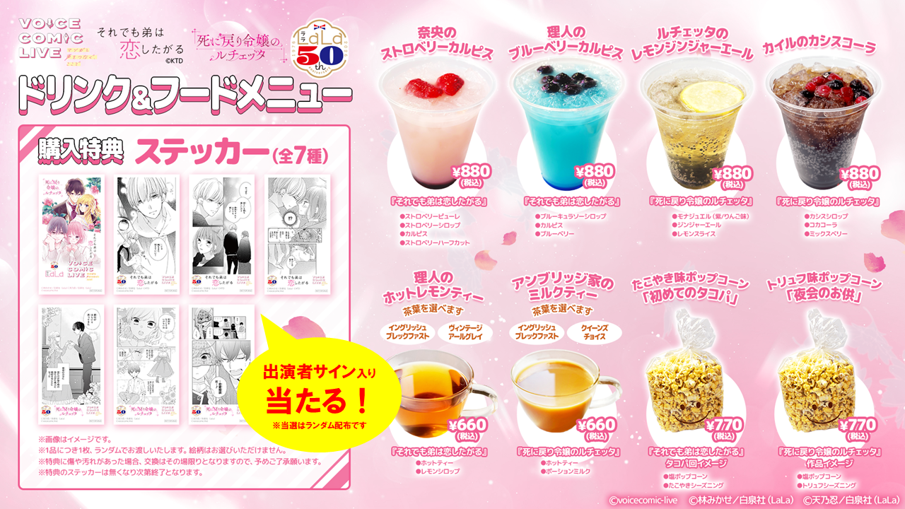 原作をモチーフとしたコラボメニューが会場限定で販売されます。1品ご注文いただくとボイスコミックライブの限定ステッカーが特典でもらえます。ランダムで出演者の直筆サイン入り特典が当たります。