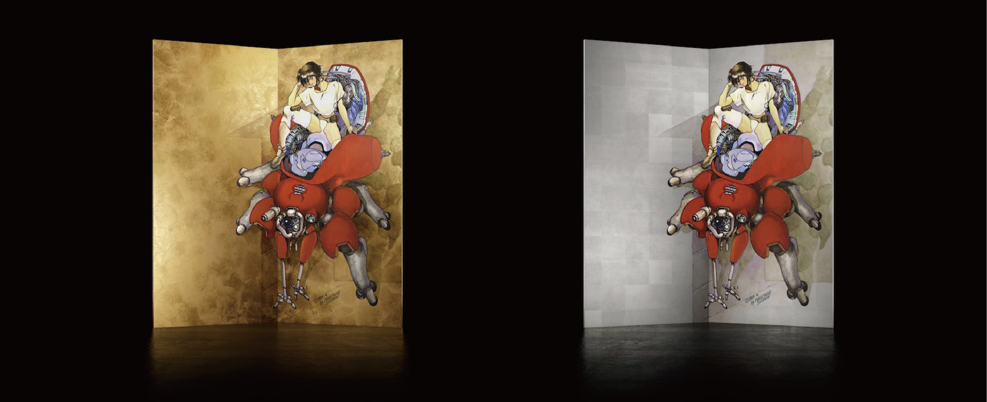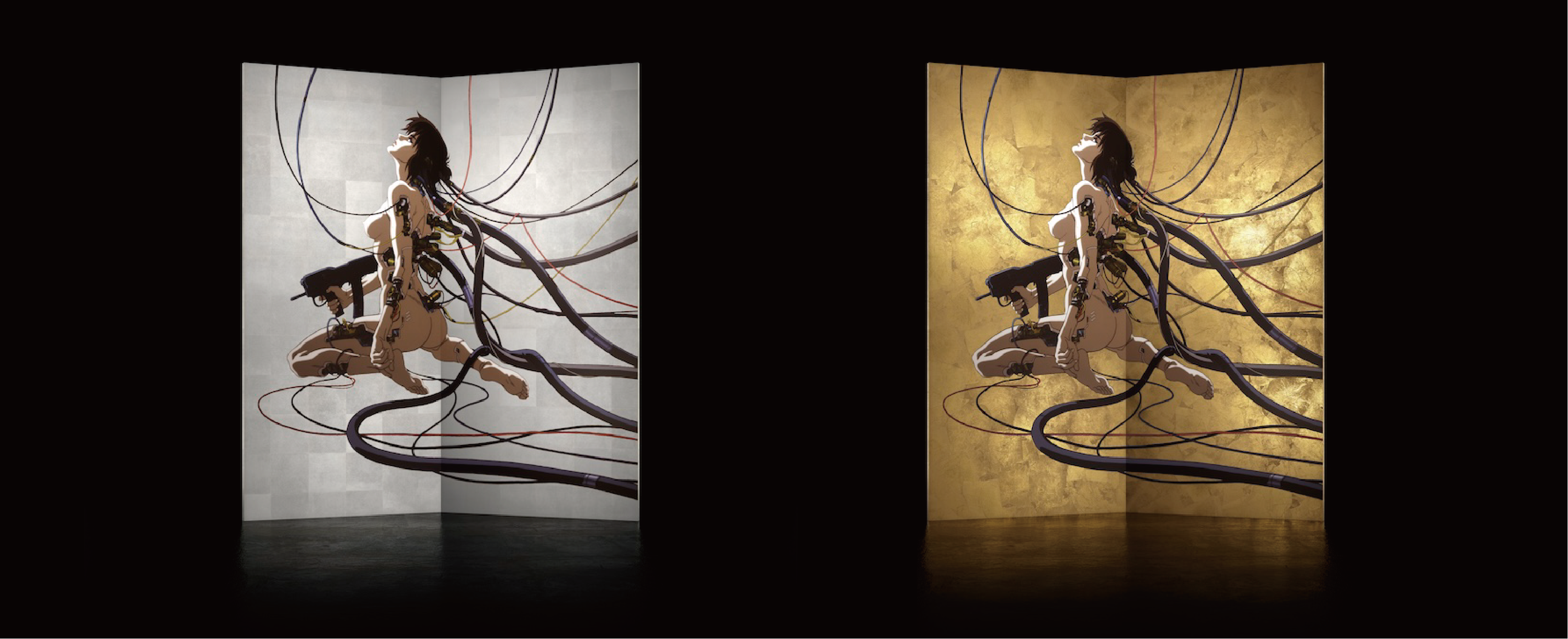 第二弾となる「TB-02: The Ghost in the Shell」シリーズは、屏風という物理的なメディウム上に『攻殻機動隊』のサイバネティックなヴィジュアルを配した、過去と未来が交錯する新世代ヴィジュアルアートです。「TB-02: The Ghost in the Shell」は、漫画原作扉絵のフチコマに搭乗する草薙素子をあしらったTB-02-KP(魂魄)と、95年アニメ映画版のワイヤーを接続した草薙素子のビジュアルを用いたTB-02-GT(義体)の2つの絵柄を、洋金箔、錫箔の2種の箔で表現した、計4種のラインナップです。