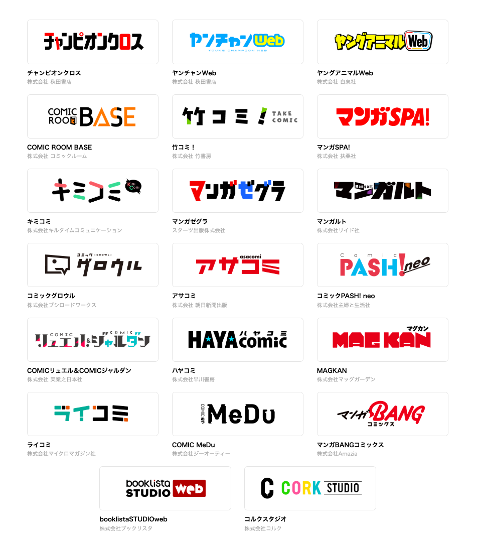 「チャンピオンクロス」「ヤンチャンWeb」(株式会社 秋田書店) / 「ヤングアニマルWeb」(株式会社 白泉社) / 「マンガゼグラ」(スターツ出版株式会社) / 「マンガルト -Mangalt-」(株式会社リイド社) / 「ハヤコミ」(株式会社 早川書房) / 「COMIC MeDu」(株式会社 ジーオーティー) / 「コミックPASH! neo」(株式会社 主婦と生活社) / 「コミックグロウル」(株式会社ブシロードワークス) / 「アサコミ」(株式会社 朝日新聞出版) / 「マンガSPA!」(株式会社 扶桑社) / 「COMICリュエル&COMICジャルダン」(株式会社 実業之日本社)/ 「竹コミ!」(株式会社 竹書房)/ 「マンガSPA!」(株式会社 扶桑社) / 「ライコミ」(株式会社 マイクロマガジン社) / 「キミコミ」(株式会社 キルタイムコミュニケーション) / 「MAGKAN」(株式会社 マッグガーデン) / 「マンガBANGコミックス」(株式会社Amazia) / 「booklistaSTUDIOweb」(株式会社 ブックリスタ) / 「コルクスタジオ」(株式会社 コルク)