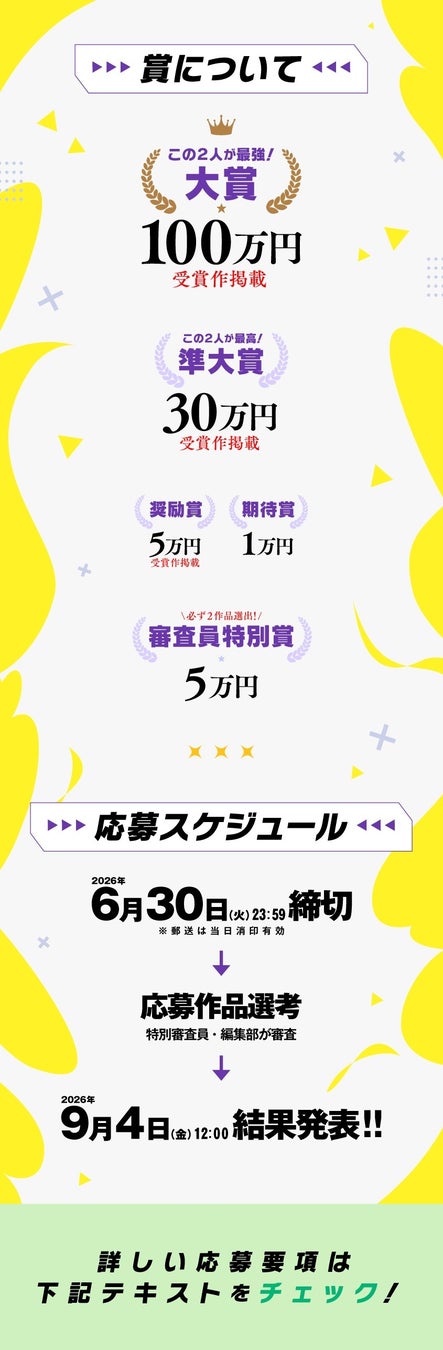 主役2人の個性や関係性を重視する漫画賞ですので、キャラクターのアイデアさえあれば受賞のチャンスが広がります。
