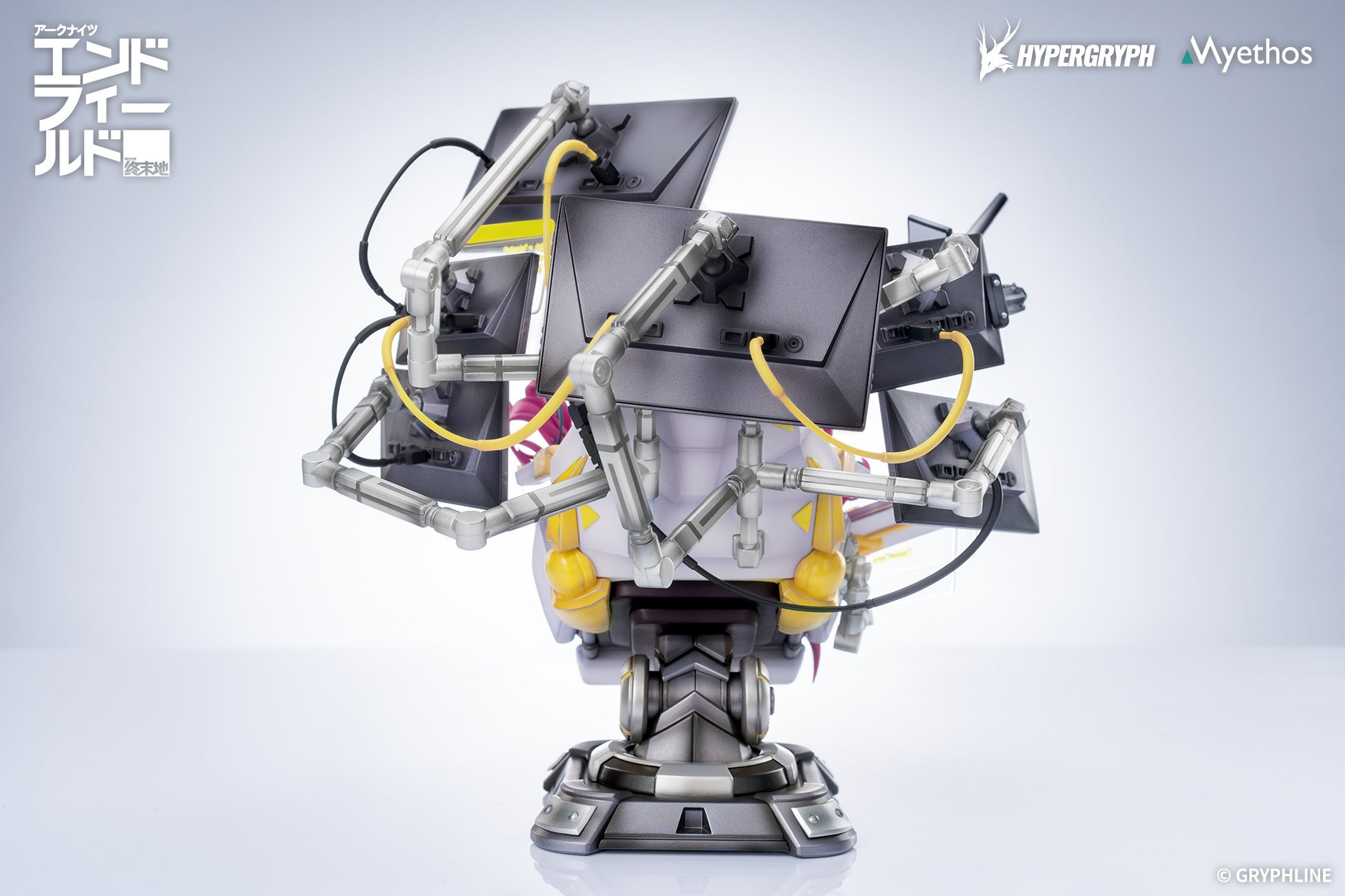 イヴォンヌはエルゴノミクスチェアにもたれ、幾重にも重なるディスプレイに囲まれた姿で立体化。精密に仕立てられたトップスに、白からピンクへとグラデーションがかかったロングパンツを合わせています。クロップドジャケットの袖口は、透明/不透明素材の組み合わせを再現し、パール塗装とホログラム調の仕上げを使い分けることで、重なり合う質感を表現。奔放なカーブを描くツインテールと、背後でうねる尻尾には多彩な色彩が施され、イヴォンヌらしい個性とトレンド感を際立たせます。