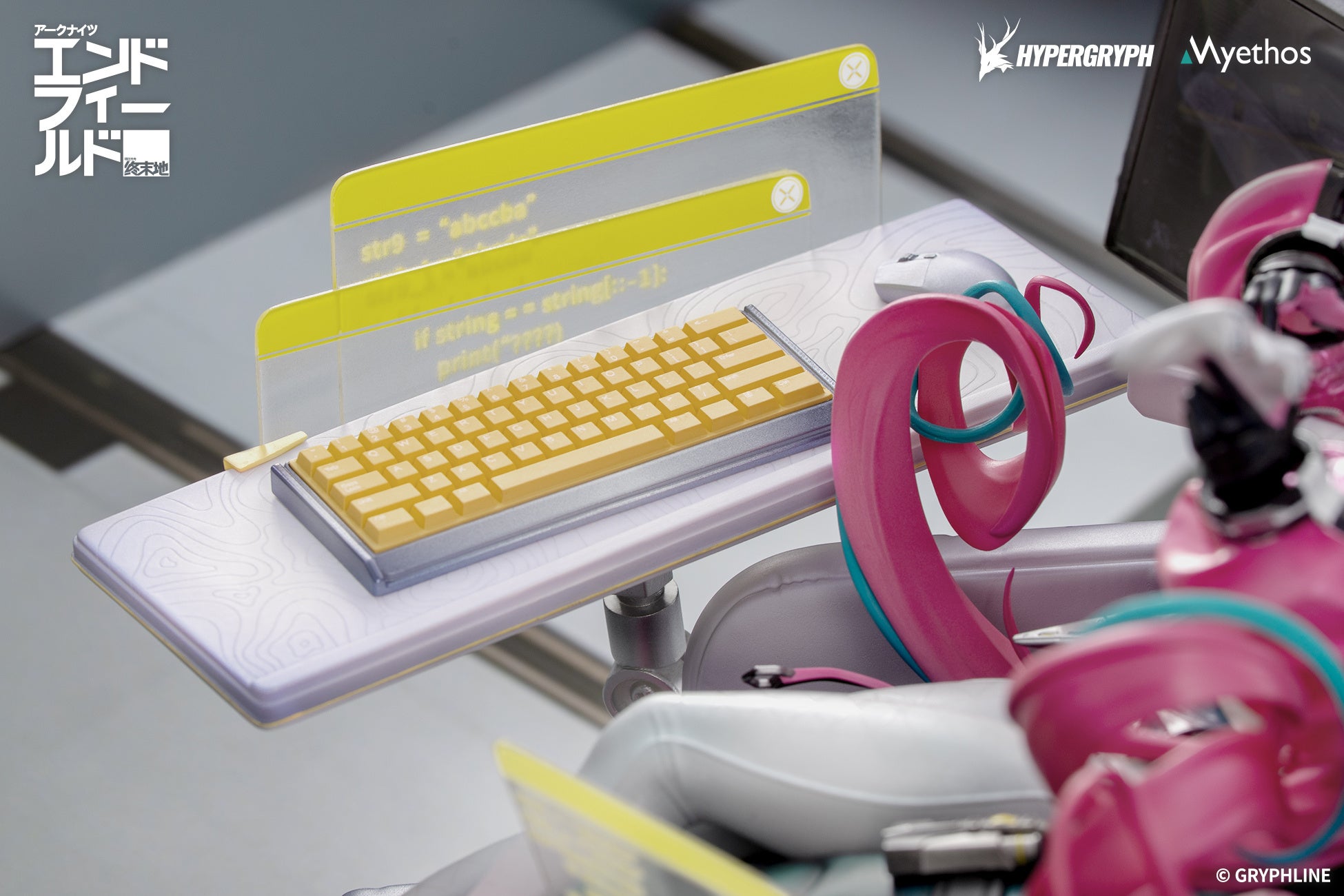 イヴォンヌはエルゴノミクスチェアにもたれ、幾重にも重なるディスプレイに囲まれた姿で立体化。精密に仕立てられたトップスに、白からピンクへとグラデーションがかかったロングパンツを合わせています。クロップドジャケットの袖口は、透明/不透明素材の組み合わせを再現し、パール塗装とホログラム調の仕上げを使い分けることで、重なり合う質感を表現。奔放なカーブを描くツインテールと、背後でうねる尻尾には多彩な色彩が施され、イヴォンヌらしい個性とトレンド感を際立たせます。