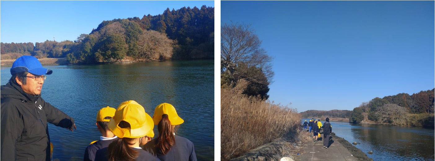 涸沼川沿いにある「織姫塚」を訪問した一行は、大洗町教育委員会の蓼沼氏から専門的な解説をいただきました。児童たちは、海水と淡水が混ざり合う「汽水域」独自の仕組みや、そこに息づく多様な生態系について学習。蓼沼氏が川面のわずかな波紋の違いを指差し、「あの波紋が他と違う場所に、潮が引くと岩が顔を出すんだよ」と説明すると、児童たちは水面下に隠された地形の不思議を熱心に観察していました。