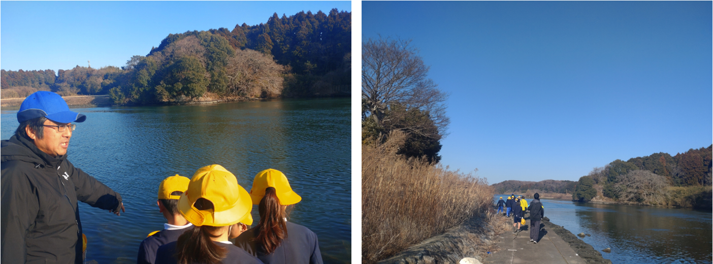 織姫塚の周辺は深い藪林(やぶばやし)に覆われており、直接立ち入るには危険が伴います。そのため、今回は対岸の水戸市側から見学を行いました。民話の中で語られている「決して近づいてはいけない」という教えを、実際の地形を目の当たりにすることで、児童たちは改めて自分事として深く胸に刻みました。