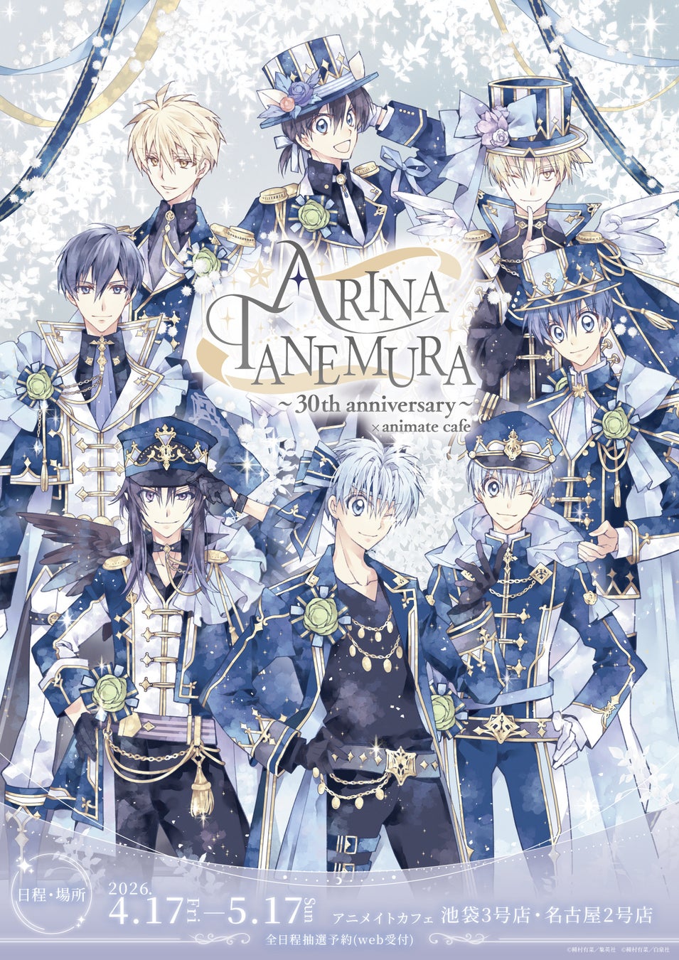 原画展「種村有菜 30周年記念展 きらめく少女たちの夢物語」の開催を記念して、アニメイトカフェとのコラボレーション「種村有菜×animate café ~30th anniversary~」が決定!本コラボカフェは、2026年4月17日〜5月17日まで実施。東京会場近郊の「アニメイトカフェ池袋3号店」と、種村有菜氏の故郷である愛知県の「アニメイトカフェ名古屋2号店」にて、開催されます。会期中は、種村有菜氏の各作品をイメージしたコラボメニューを提供するほか、オリジナルグッズの販売も!カフェのご来場に当たっては、いずれの店舗も、全日程アニメイトカフェ抽選予約システム内でのWEB抽選予約が必須です。オリジナルグッズの情報解禁を始めとする最新情報はアニメイトカフェ公式サイト・公式SNS(@animate_cafe)にて随時お知らせいたします。