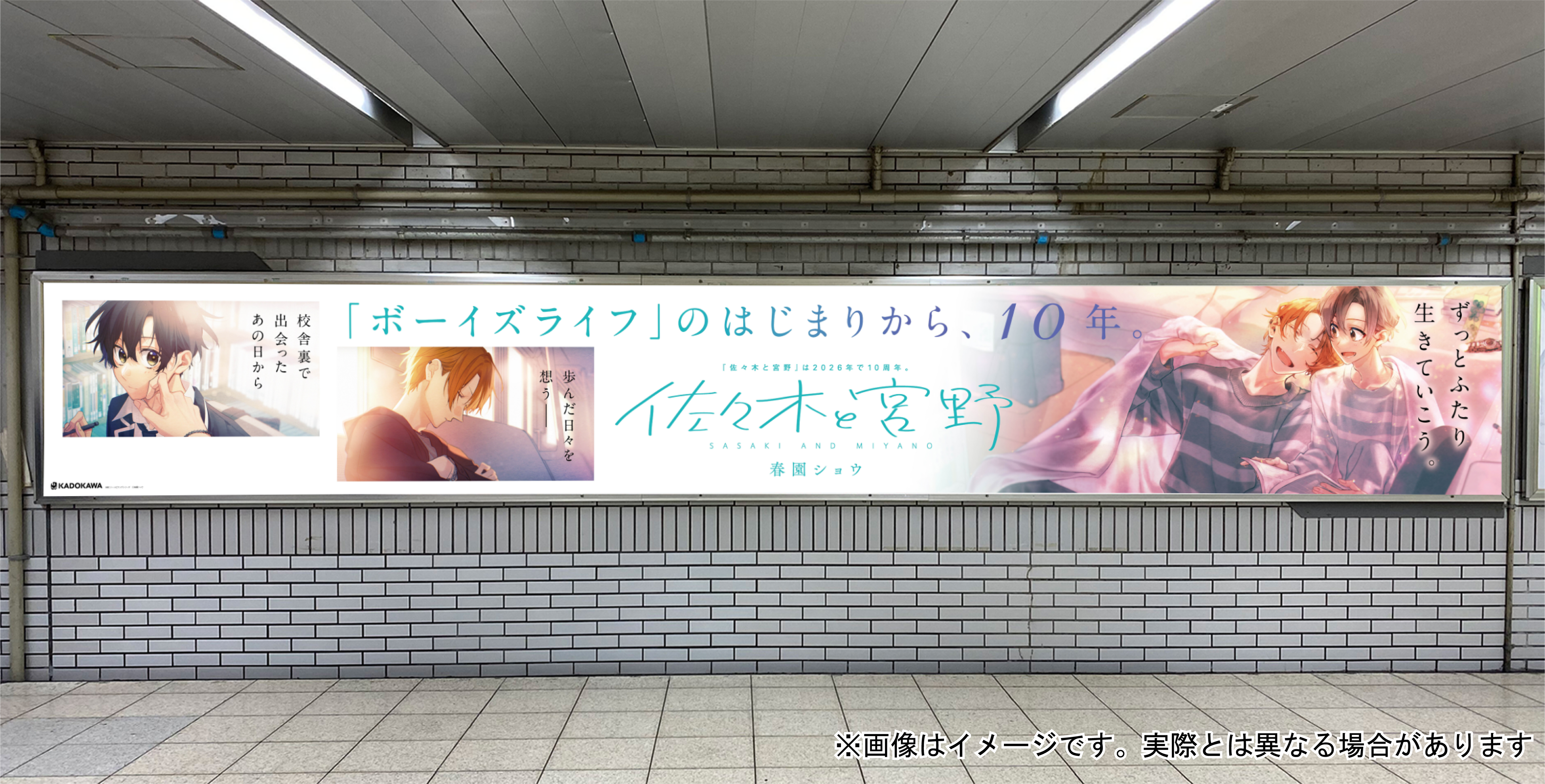 無料WEBマンガサイト「ジーンピクシブ」にて好評連載中のゆるキュンBLシリーズ『佐々木と宮野』(著:春園ショウ)が、2026年で連載開始から10周年を迎えました。これを記念して、2月23日より池袋駅で交通広告を実施します。またコミックス最新11巻が2月27日(金)より全国書店・WEBストアにて発売いたします。