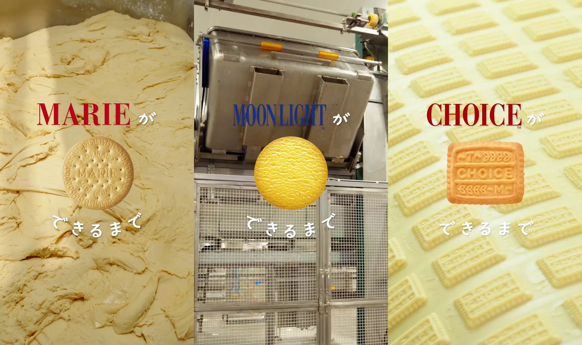 代表的な3商品「マリー」「ムーンライト」「チョイス」それぞれの製造工程を紹介する3本と、その内容をまとめた総集編の計4本を同時公開。普段目にすることのできない “ビスケット製造の裏側“を、コンパクトにわかりやすく、そしてなんだか食べたくなるようなワクワクする動画をお届けします。