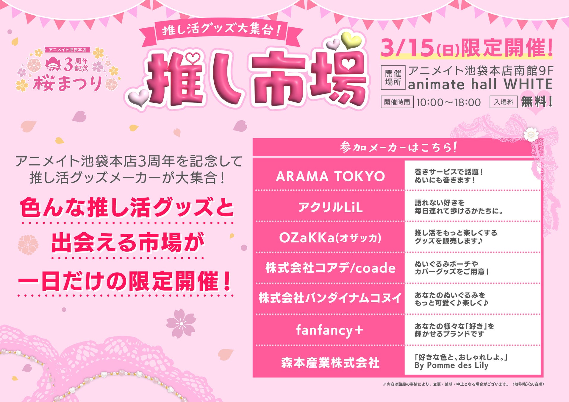 内容:アニメイト池袋本店3周年を記念して、桜まつり抽選会を開催! 3周年を記念した、豪華景品をラインナップ。