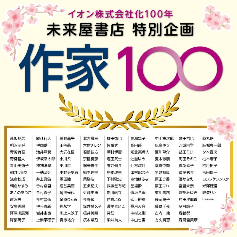 株式会社未来屋書店(本社:千葉市美浜区、代表取締役社長:平川雅隆、以下、 未来屋書店)は、イオンの株式会社化100年を記念し、2026年3月6日(金)から4月25日(土)までの期間、特別企画『作家100』フェアを全国の未来屋書店200店舗で開催します。