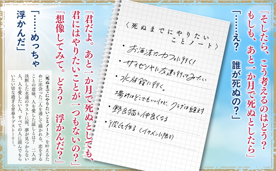 2月27日(金)、主婦と生活社によるブルーライト文芸書籍レーベル「セツナイ青」シリーズに、恋愛マイスター・メンヘラ大学生による初の長編恋愛小説が登場。<死ぬまでにやりたいことノート>を叶えるために出会った二人を通して描かれる、恋をすることの意味、人を愛した証しとは? あなたはきっと、二人が決断した永遠のラストに涙する。
