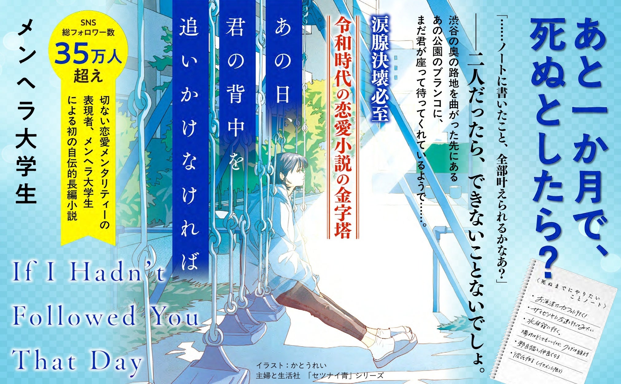 2月27日(金)、主婦と生活社によるブルーライト文芸書籍レーベル「セツナイ青」シリーズに、恋愛マイスター・メンヘラ大学生による初の長編恋愛小説が登場。<死ぬまでにやりたいことノート>を叶えるために出会った二人を通して描かれる、恋をすることの意味、人を愛した証しとは? あなたはきっと、二人が決断した永遠のラストに涙する。